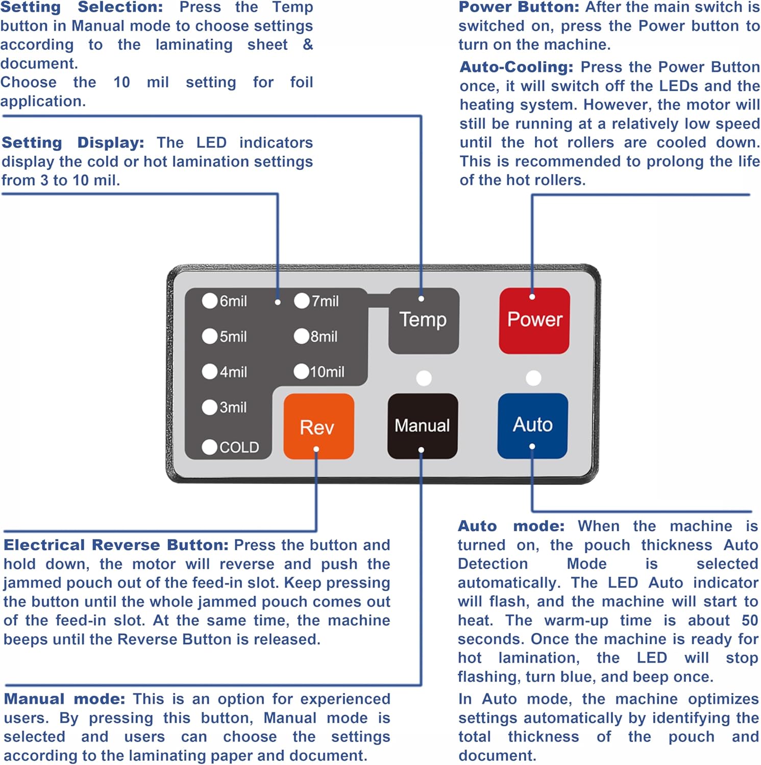 - 【Patented Auto Sense Thickness Detection】The machine optimizes settings automatically by identifying the total thickness of your pouch and document. It is ideal for large office, school and commercial use.