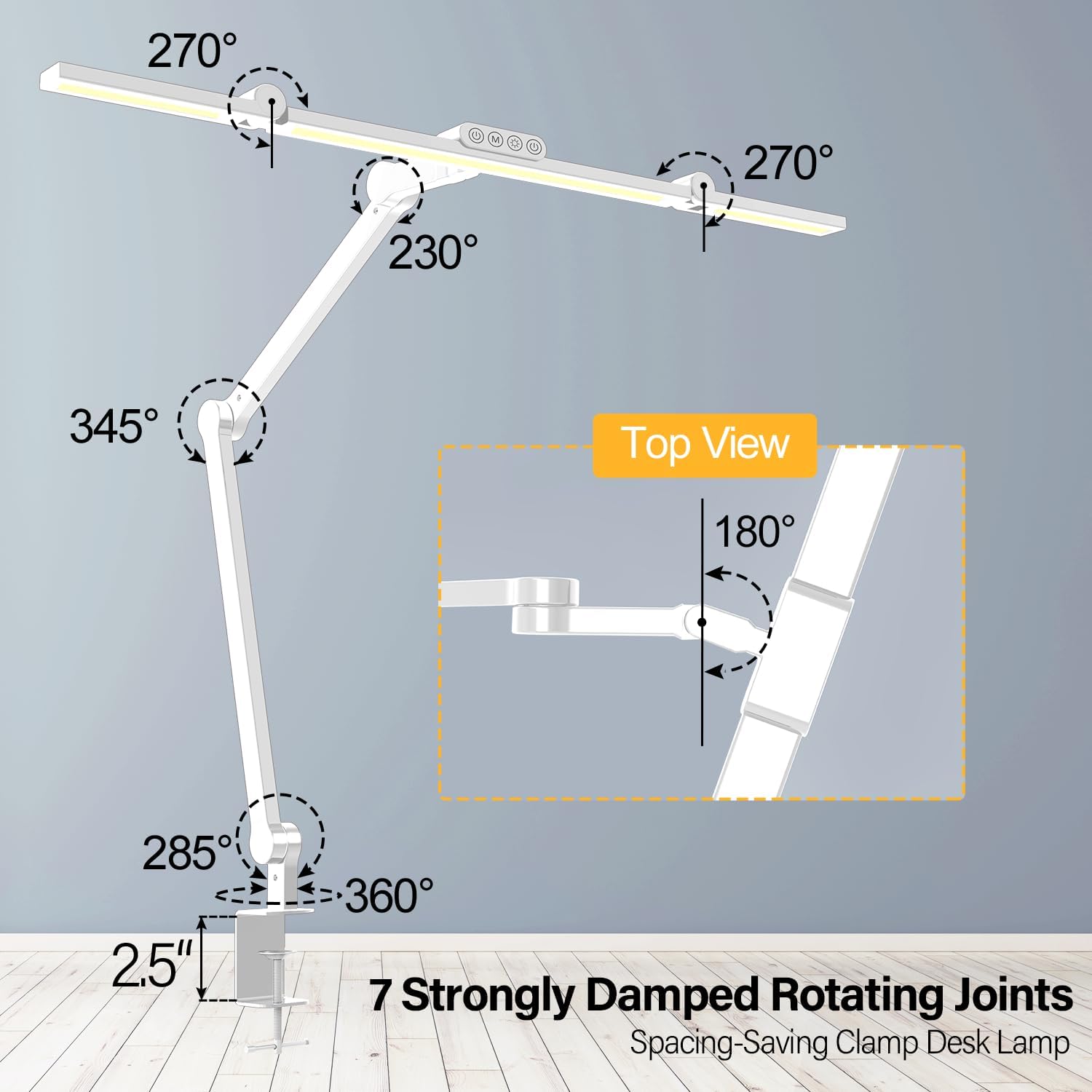 - 【7 Rotatable Joints】: Micomlan swing arms led desk light features 7 strongly damped joints with 3 ultra bright light bars design for freely vertical adjustment and horizontal adjustment. You can rotate the bilateral light bars vertically to change the illumination angle. Turn them up to expand the lighting coverage to illuminates your entire desk or turn them down to create a super bright lighting area for sewing crafting. You can also rotate the base to adjust the light direction and position.