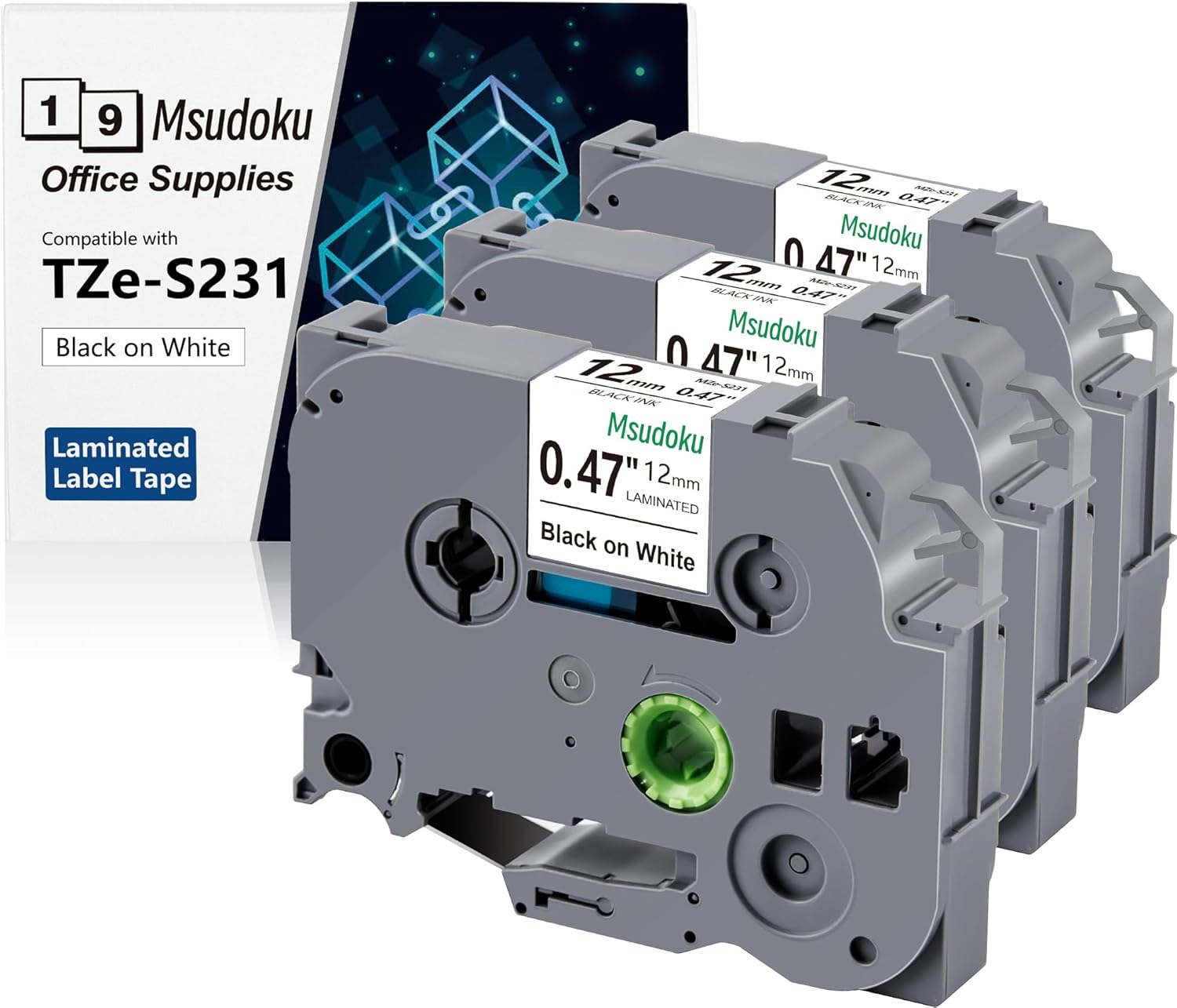- Package Includes: 3-pack compatible with brother p touch label maker TZ S231 tape black on white 12mm 0.47 inch TZS231 tape. Size: 1/2 Inch x 26.2 ft ( 12mm x 8m ) Color: Black on White TZe TZ Tape
