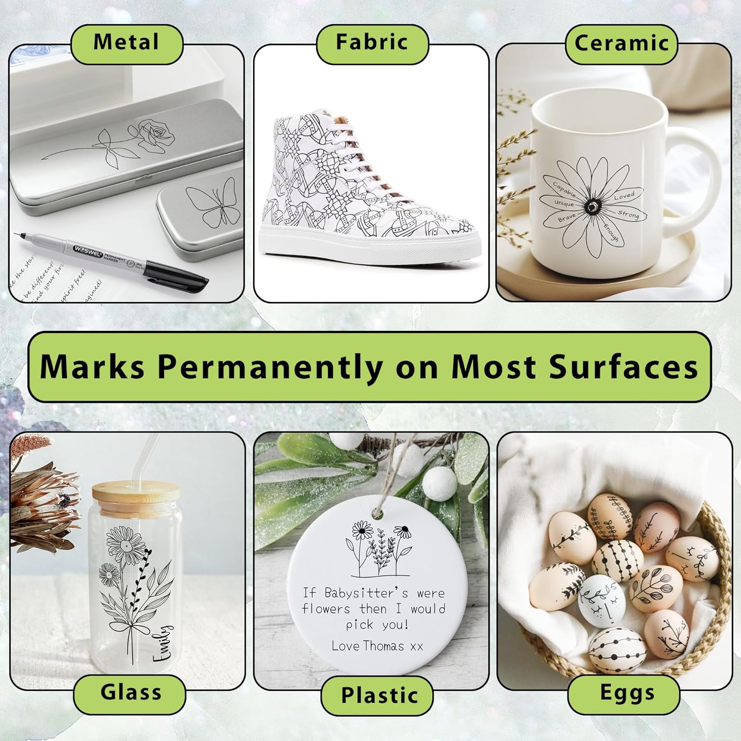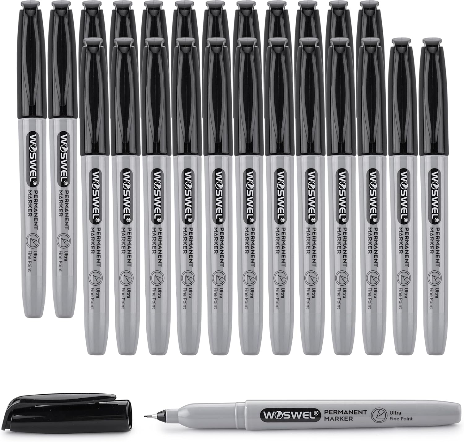 - WOSWEL 24 premium black ultra fine point permanent markers, mark on paper, glass,ceramic, plastic, wood, rock, metal and almost all surfaces.