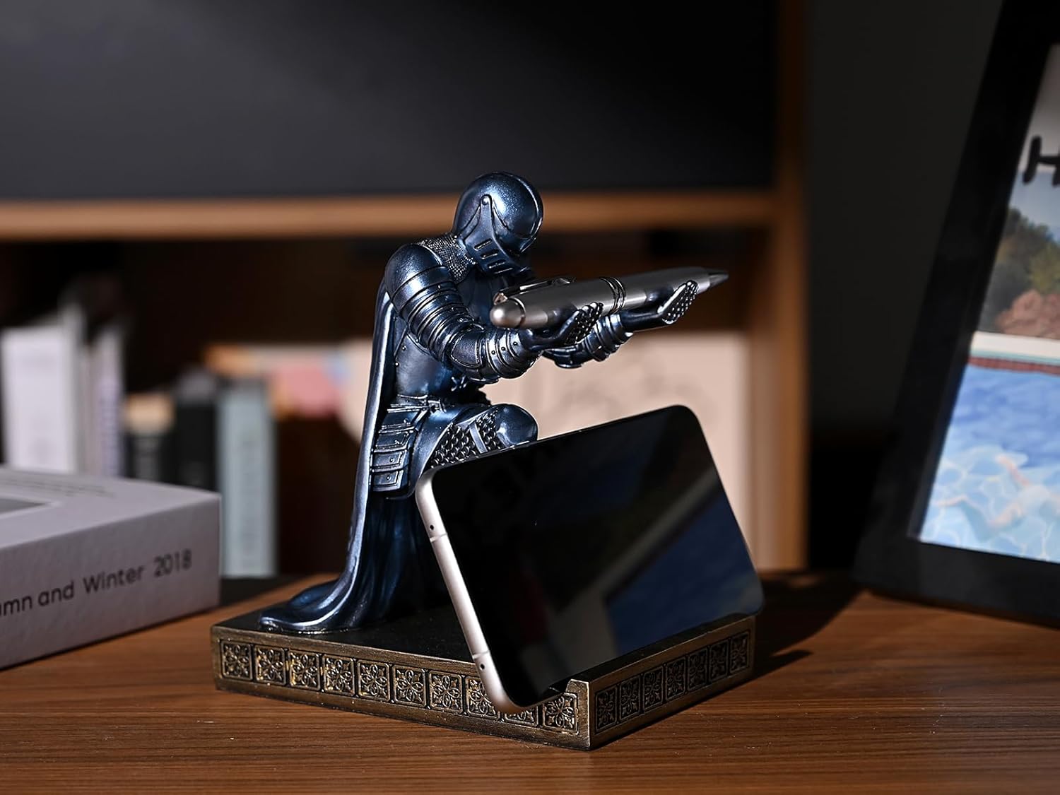 Windbreaker Soldier Knight Pen Holder Personalized Desk Accessory, Mobile Phone & Gaming Controller Holder, Device Stand Gift for Medieval Enthusiasts (Blue)