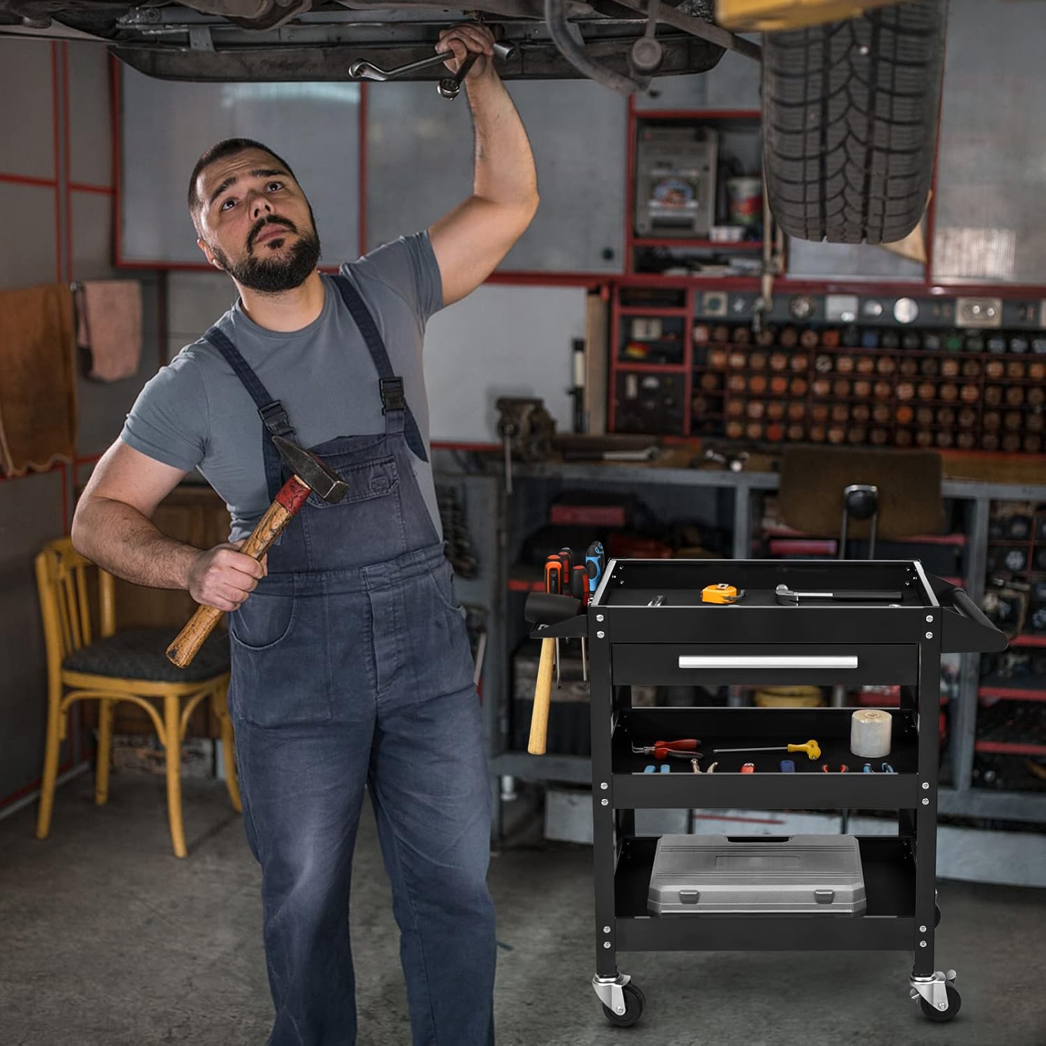 - 🛠️High Storage Capacity: Our rolling tool cart is made of 3 shelves with side walls to prevent tools falling off and non-slip cushions. The top tier can store frequent tools, the middle tier can store 24''x16''x7'' capacity space, and the bottom tier can store large tools like toolboxes.
