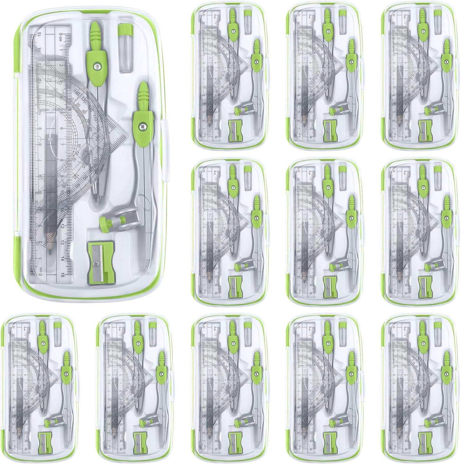 Teling 12 Sets Math Geometry Kit for Students 10 Pcs Compass Geometry Tools Set Includes Rulers Protractor Compass Eraser Pencil Sharpener Lead Refills Pencil (Green)