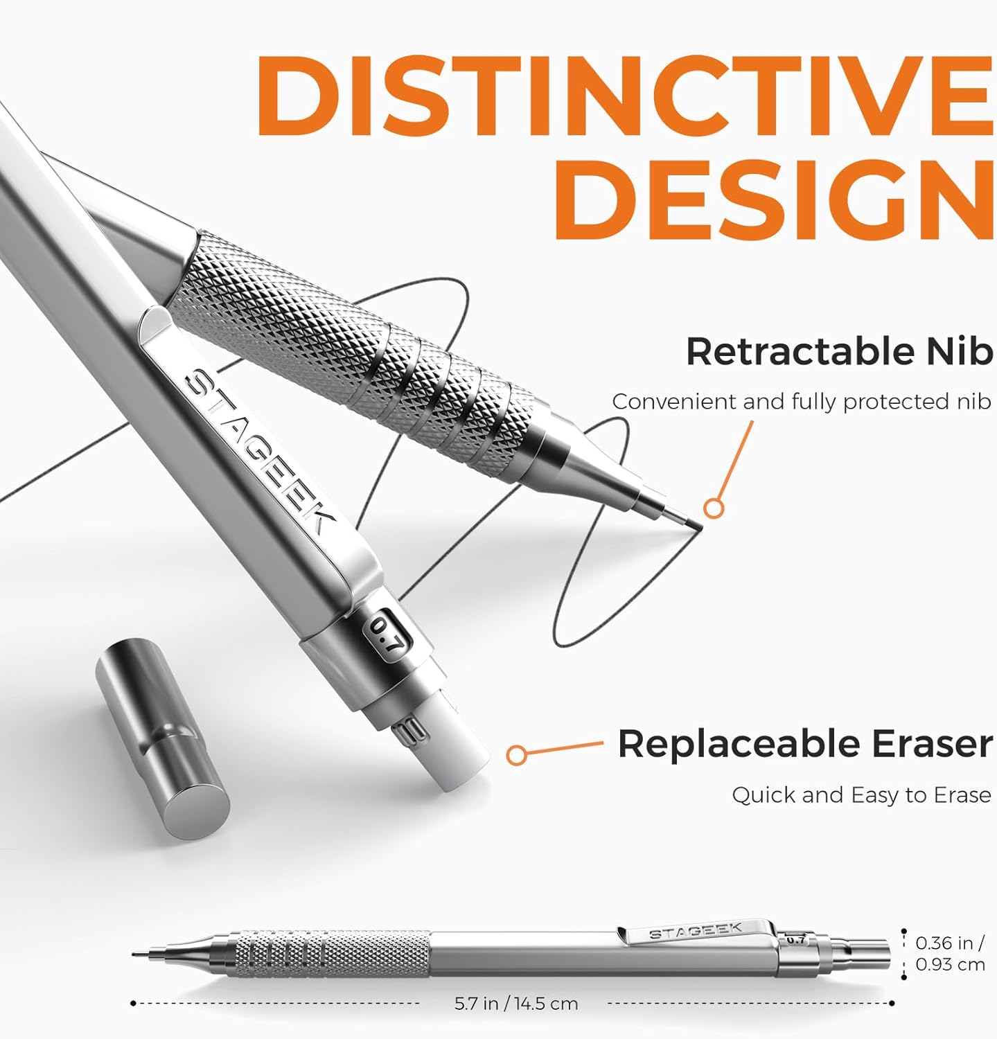 21PCS Metal Mechanical Pencil Set, Art Lead Pencil 0.3, 0.5, 0.7, 0.9, 2mm Holder(HB 2H 2B 4B Color) with 10 Tubes Graphite Lead Refills Eraser with Case for Drafting Drawing Sketching