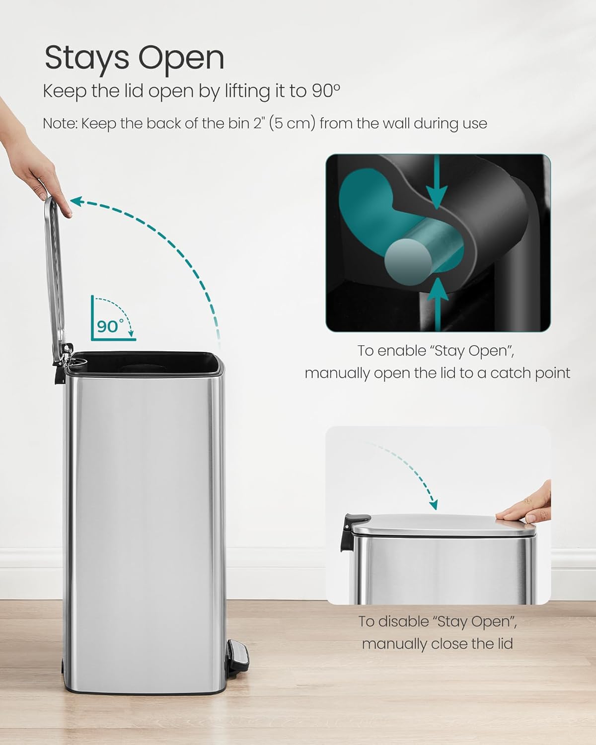SONGMICS Kitchen Trash Can, 8-Gallon (30 L) Trash Bin, Stainless Steel Garbage Can, with Inner Bucket, Soft Close and Stays Open, Metallic Silver ULTB593E01