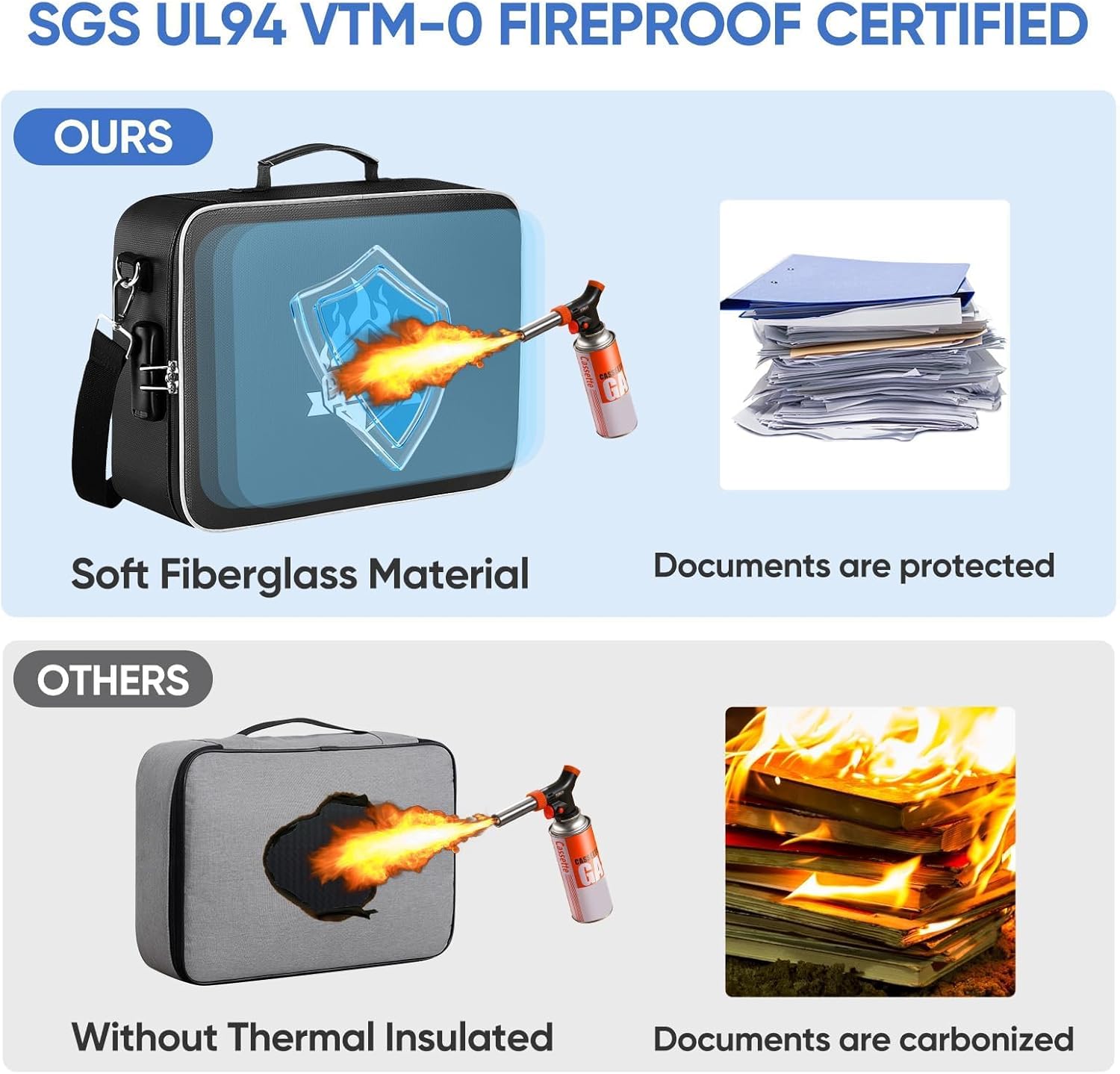 - Fireproof and Waterproof: The fireproof document box /bag is made of dust-proof silicone fiberglass, offering fire resistance up to 2192℉, SGS-certified (UL94 VTM-0); Its waterproof design protects your documents from rain and spills (No folders included)