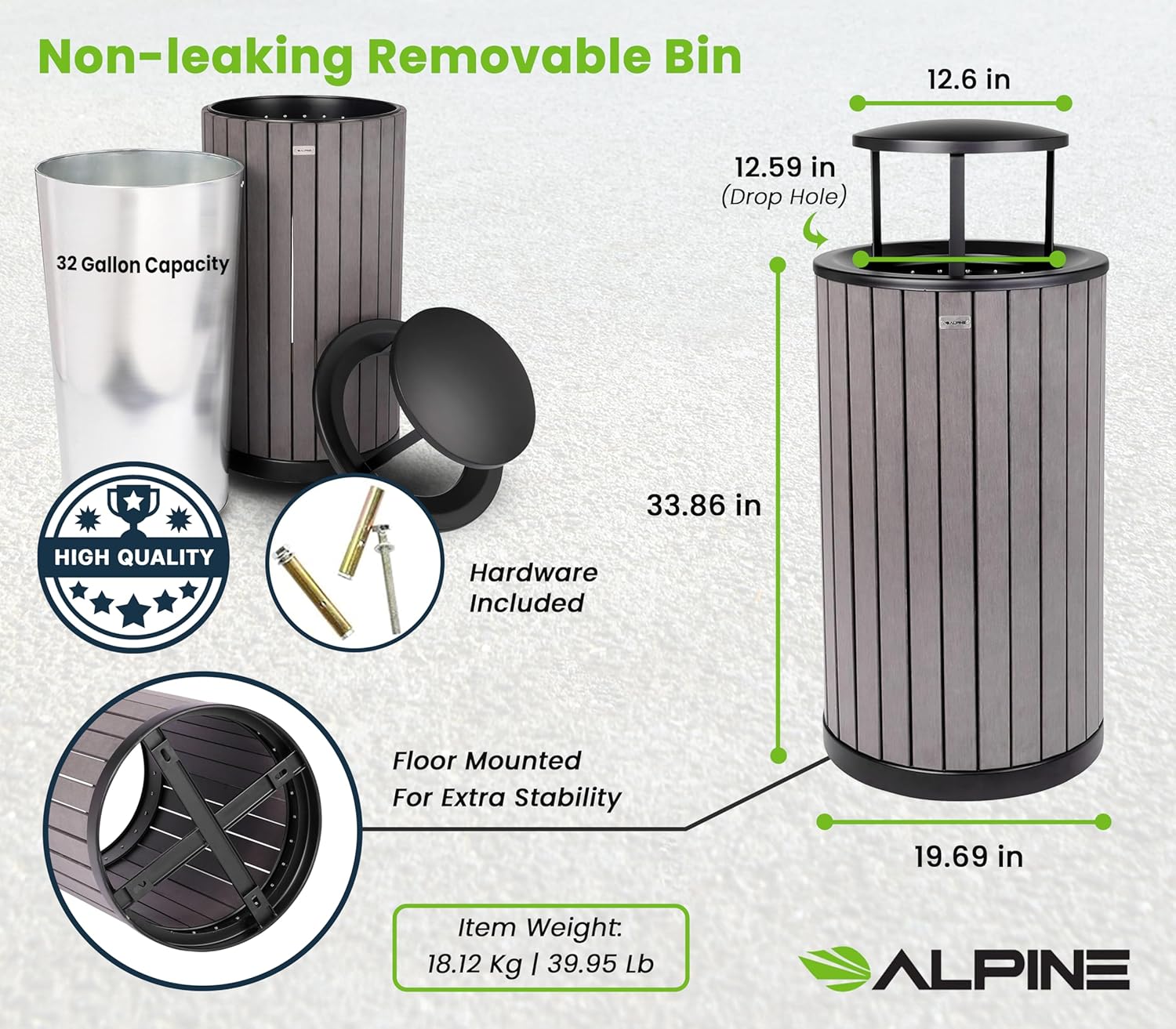 - CLASSIC DESIGN: The Alpine Outdoor Trash Can has great design that blends in naturally in any environment, while keeping them clean and litter free. With a grey classic look, this trash can will be the perfect addition to any area without drawing any extra attention.