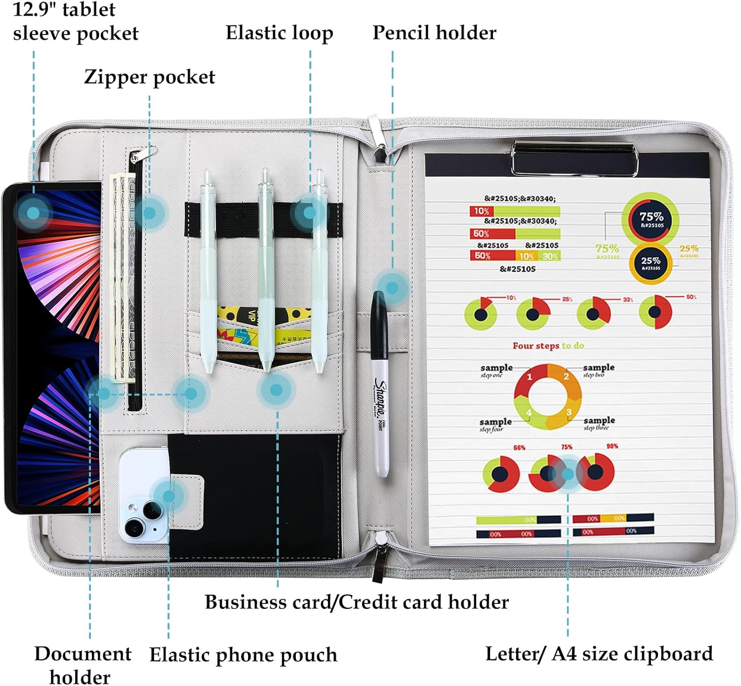- Multiple Compartments: [left side] business card holders, pencil holders, a pocket, a 12.9" tablet sleeve, elastic phone pouch, file folder and zipper pocket; [middle] a pencil holder; [right side] a clipboard and 20 pages notepad; [outside] Extra pocket