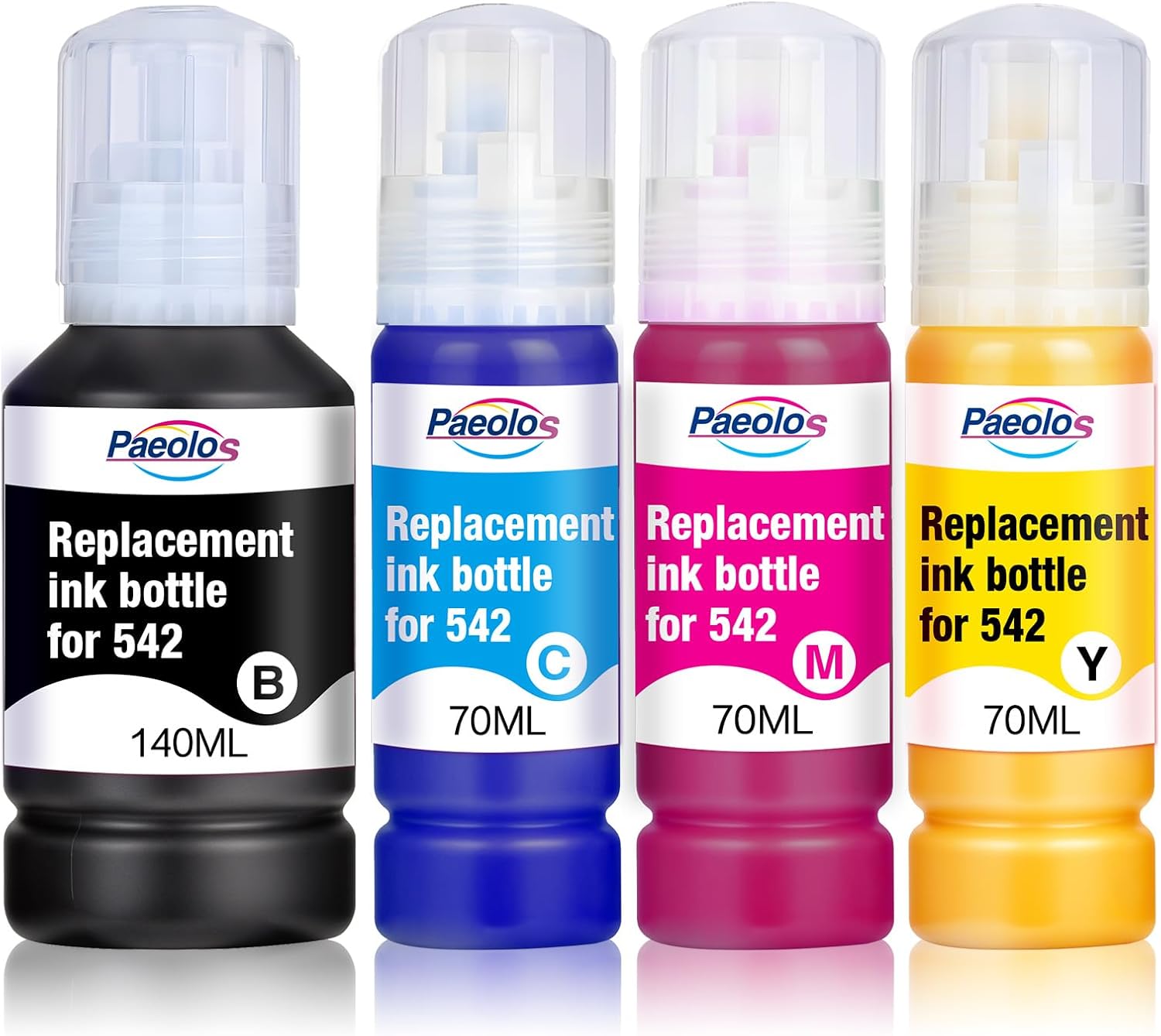 - Package Included: Total 4 pack of replacement for 542 ink bottles. 1 Black replacement for 542 Ink refill bottle (140ml); 1 Cyan replacement for 542 refill ink (70ml) ; 1 Magenta replacement for 542 printer ink (70ml); 1 Yellow ink refill replacement for 542 ink (70ml)