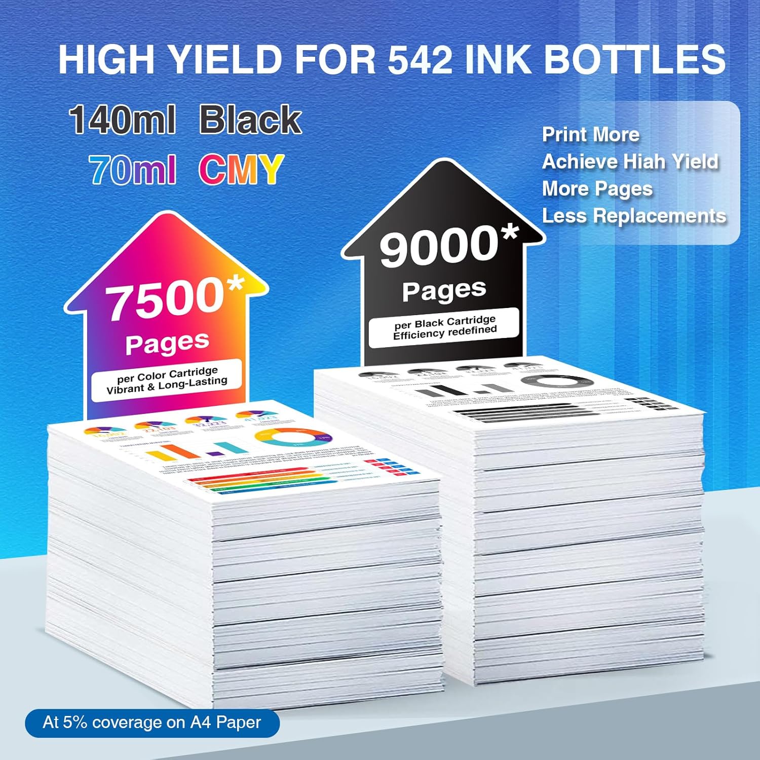 - High Page Yield: Up to 9,000 Pages per replacement for 542 black ink bottle; and 7,500 pages per replacement for 542 Cyan/Magenta/Yellow refill ink bottle; The page yield of replacement for 542 ink refill bottles are based on 5 percent coverage of A4 paper