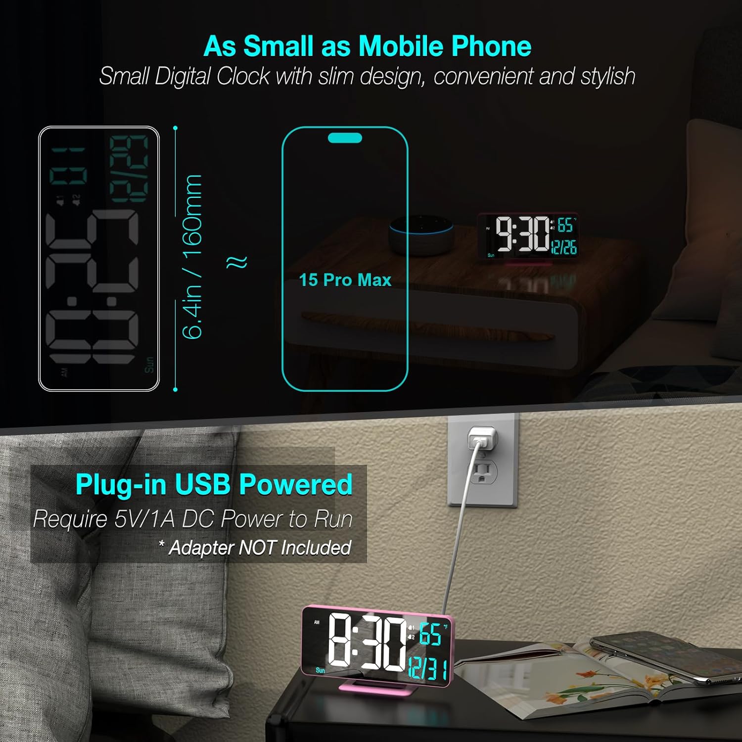 - [6.7in Pink Digital Clock] This cute pink clock features 6.7-inch display of mirror clock style, dual alarms, 12/24-hour format, date, day of week, seconds, temperature (℉ / ℃), and auto/manual dimming, it is also a modern digital calendar and cute alarm clock for girls bedroom decor. Additionally, the bright white and sky blue digits make the desk clock so cool and easy-to-read.
