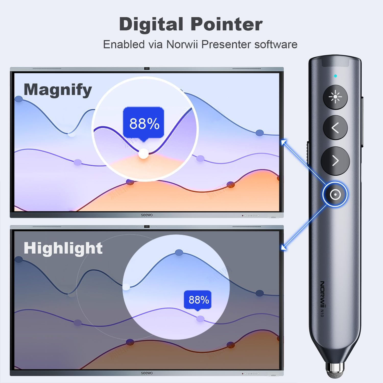 - Customizable - ① The size, color, and contrast of the Digital Pointer can be customized in the Norwii Presenter APP. ② Digital Pointer can be customized with cartoons/logos or any pattern you like in the APP. ③You can also customize the function definitions of certain keys in the Norwii Presenter app