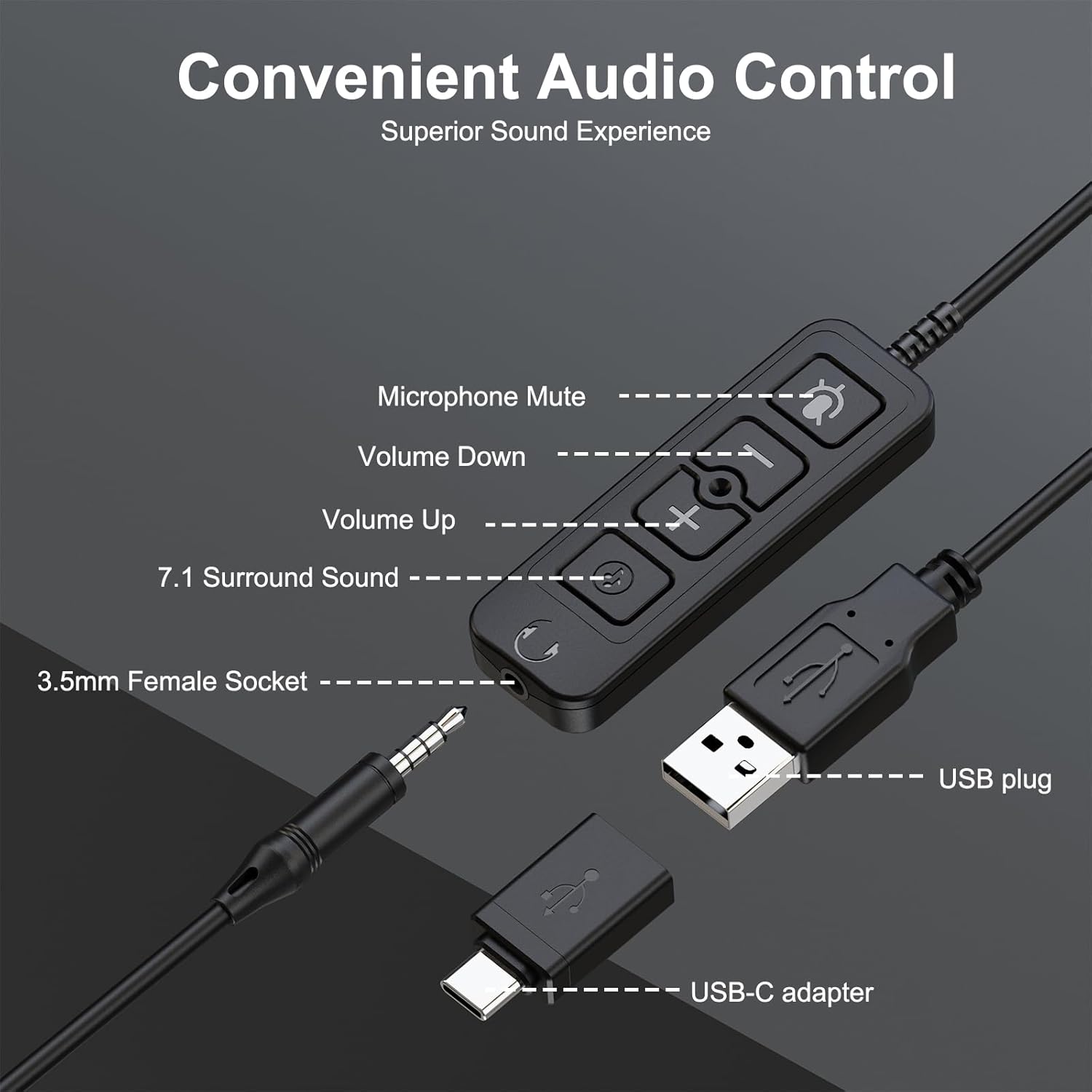 - EASY-ACCESS AUDIO CONTROL: The wired headset with microphone features volume+/- buttons, microphone mute functions, and a switch for selecting different sound effects. This provides you with the flexibility to adjust settings effortlessly, whether you're at home, in the office, or on the go, and across any application.