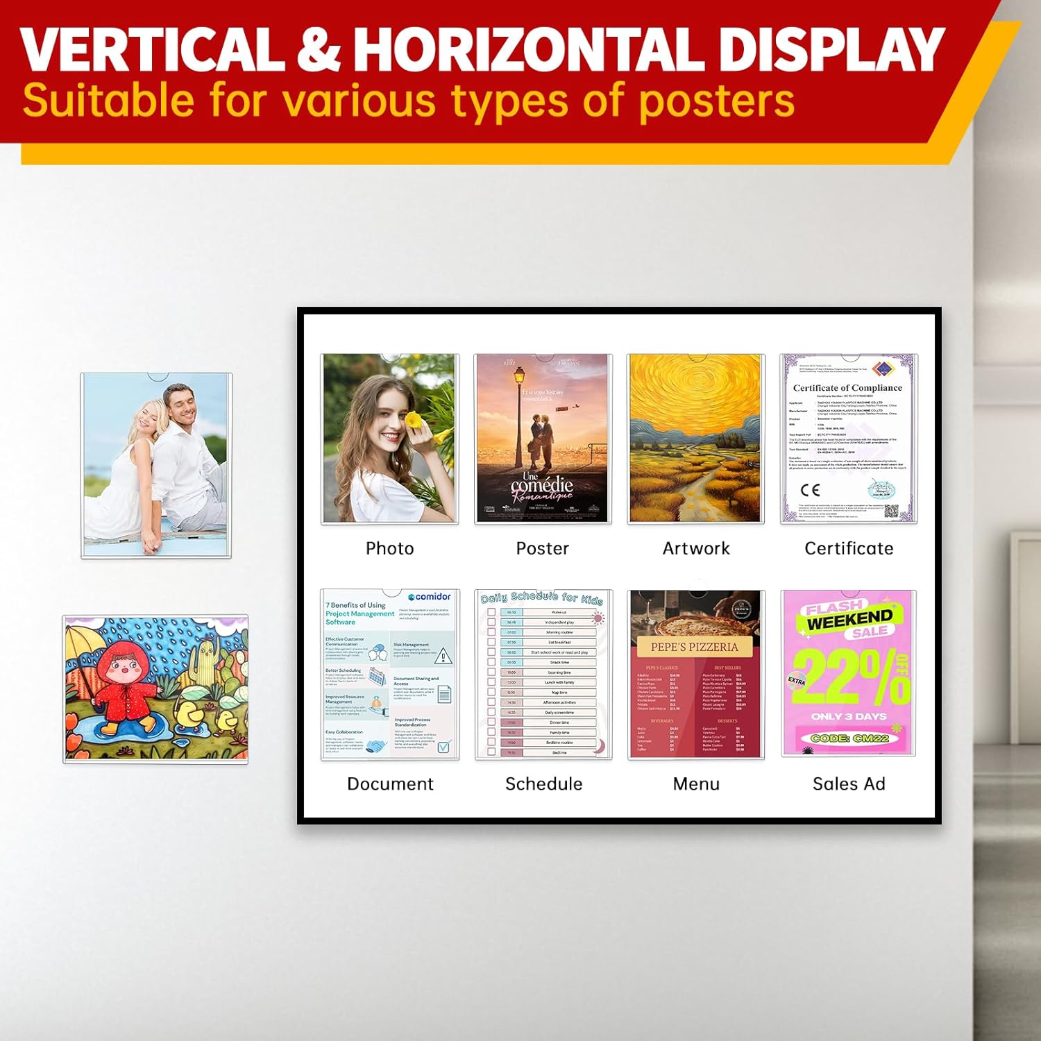 - 【DOUBLE-SIDED DISPLAY】Double-sided visibility design of reusable adhesive frames allows people to view content of posters from both sides on any transparent surface. Magnetic photo frames can display your posters horizontally or vertically according to your needs. Window sign holder is 0.04” thick and can hold about 4 sheets of 8 1/2 x 11 paper.