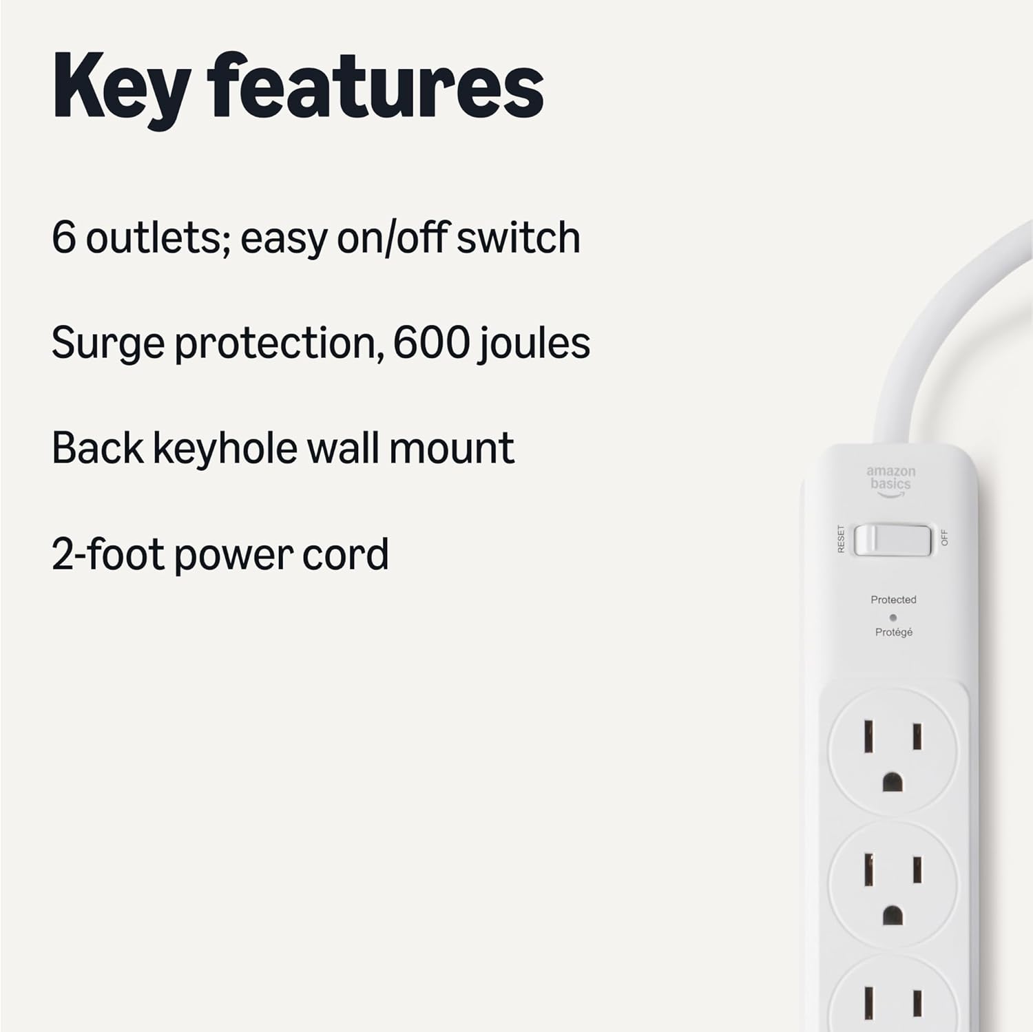 Amazon Basics Rectangle 6-Outlet, 600 Joule Surge Protector Power Strip, 2ft, Small, White, 2-Pack