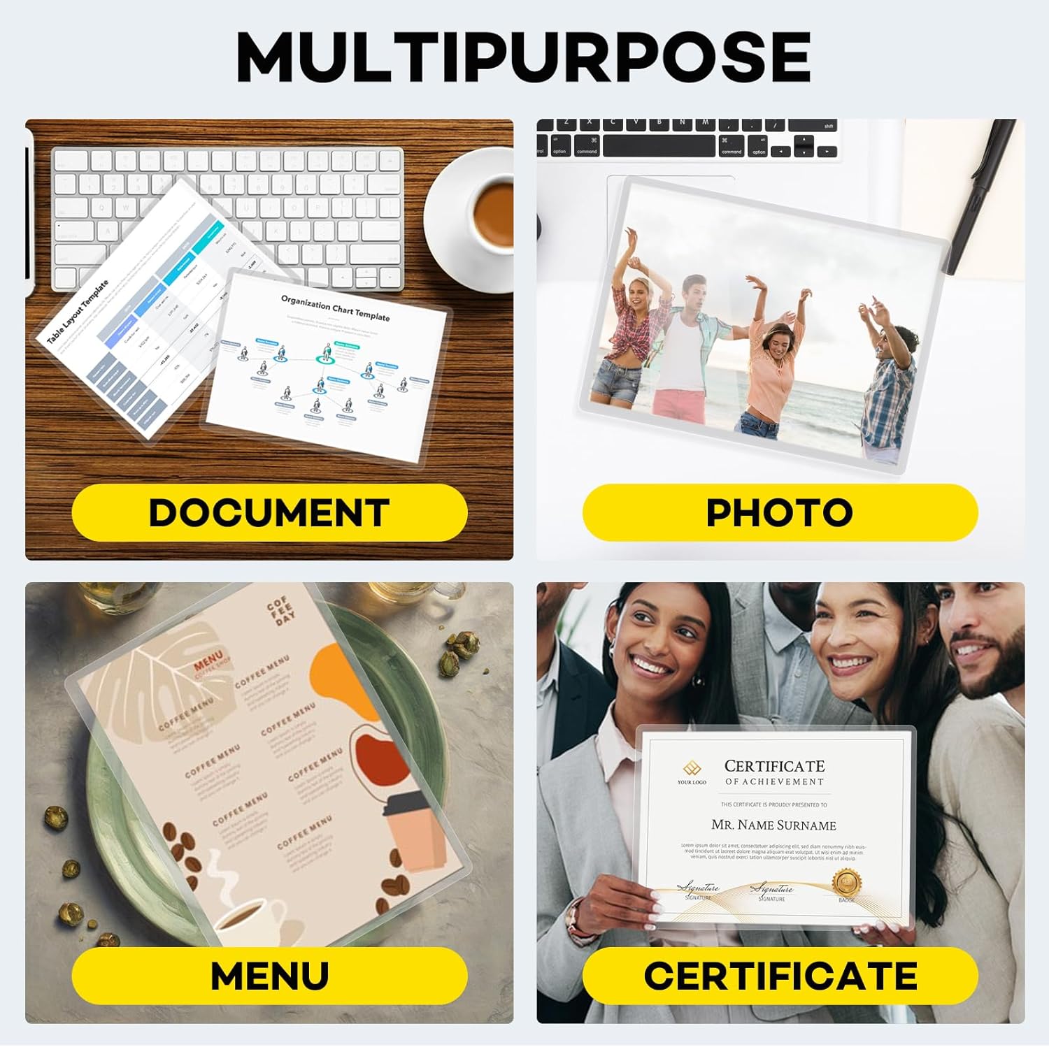 - Application:Perfect for protecting certificates,signs,photos,awards,calendars,kids artworks. It can seal and protect your documents it can be used in classroom, home and office. Compatible with all thermal laminator machine brands. Thermal laminator needed, not self-adhesive
