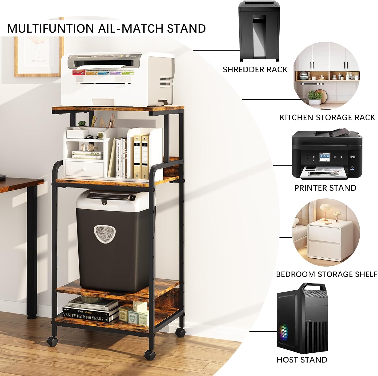 - 【Multi Scenario Use】:It's not just a printer stand. It can be a shelf with lots of books; A music station for record players and records; A kitchen cart for a microwave, POTS and pans; A side table for coffee and snacks. More uses are waiting to be discovered.