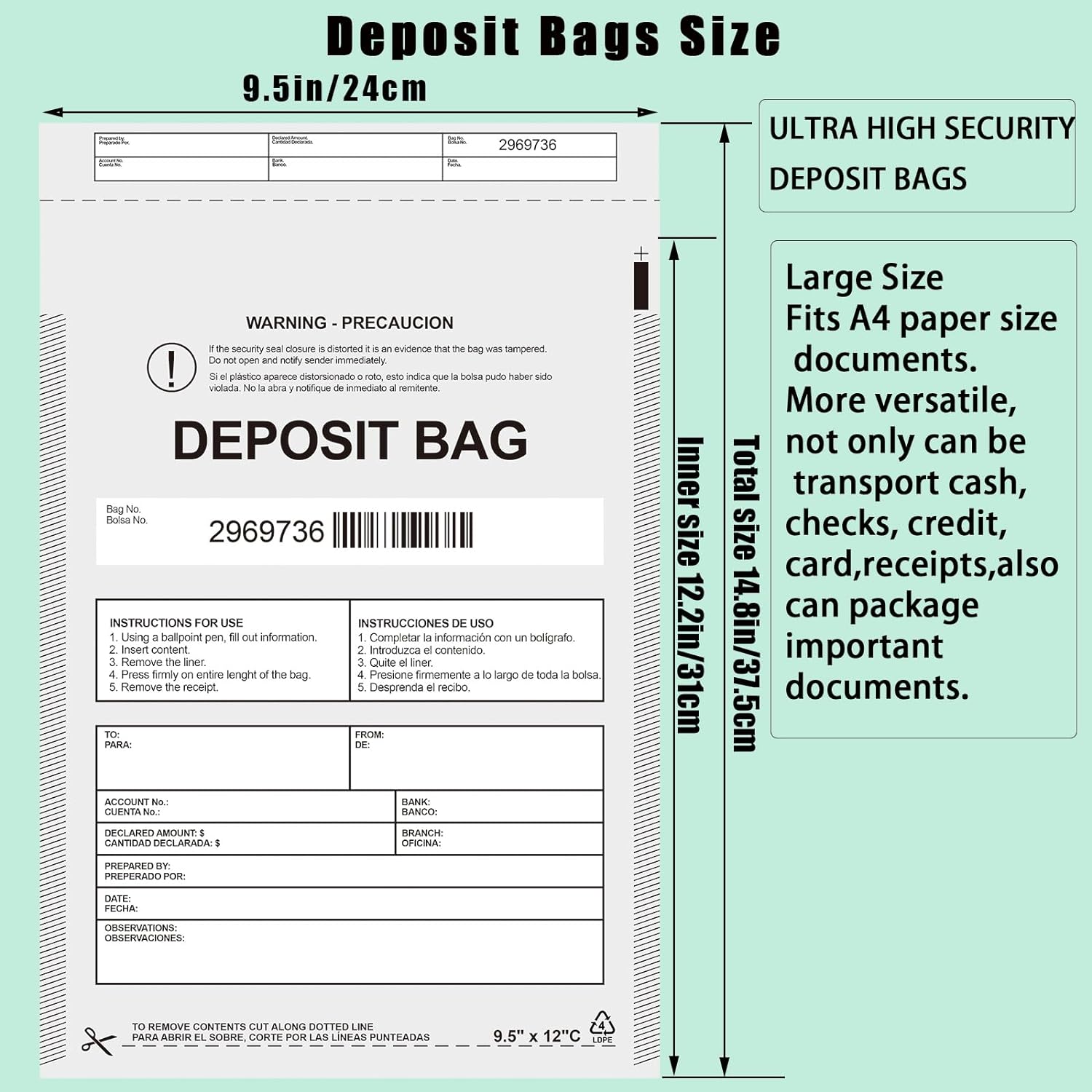 - Large Size Widely Used:Our deposit bags large size design,total size is 9.4''x 14.8'', inner size: 9.4''x 12'', which can easily accommodate large-size documents such as A4 documents,we deposit bags stands out as the ultimate choice for facilitating cash handling,securing bank deposits, ensuring safe currency or important documents transportation, meeting the demands of various high-security activities such as storage of important items