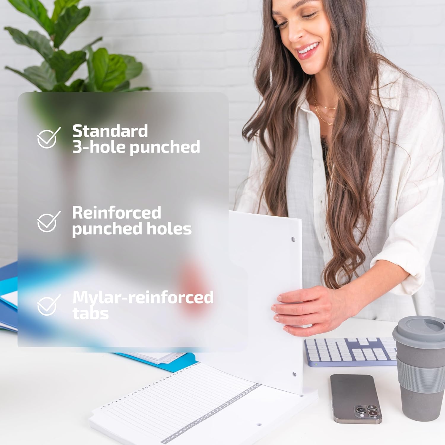 - REINFORCED PUNCHED HOLES: Each hole punch is reinforced to prevent tearing or damage. The tabs are ideal for home, office, and school use.