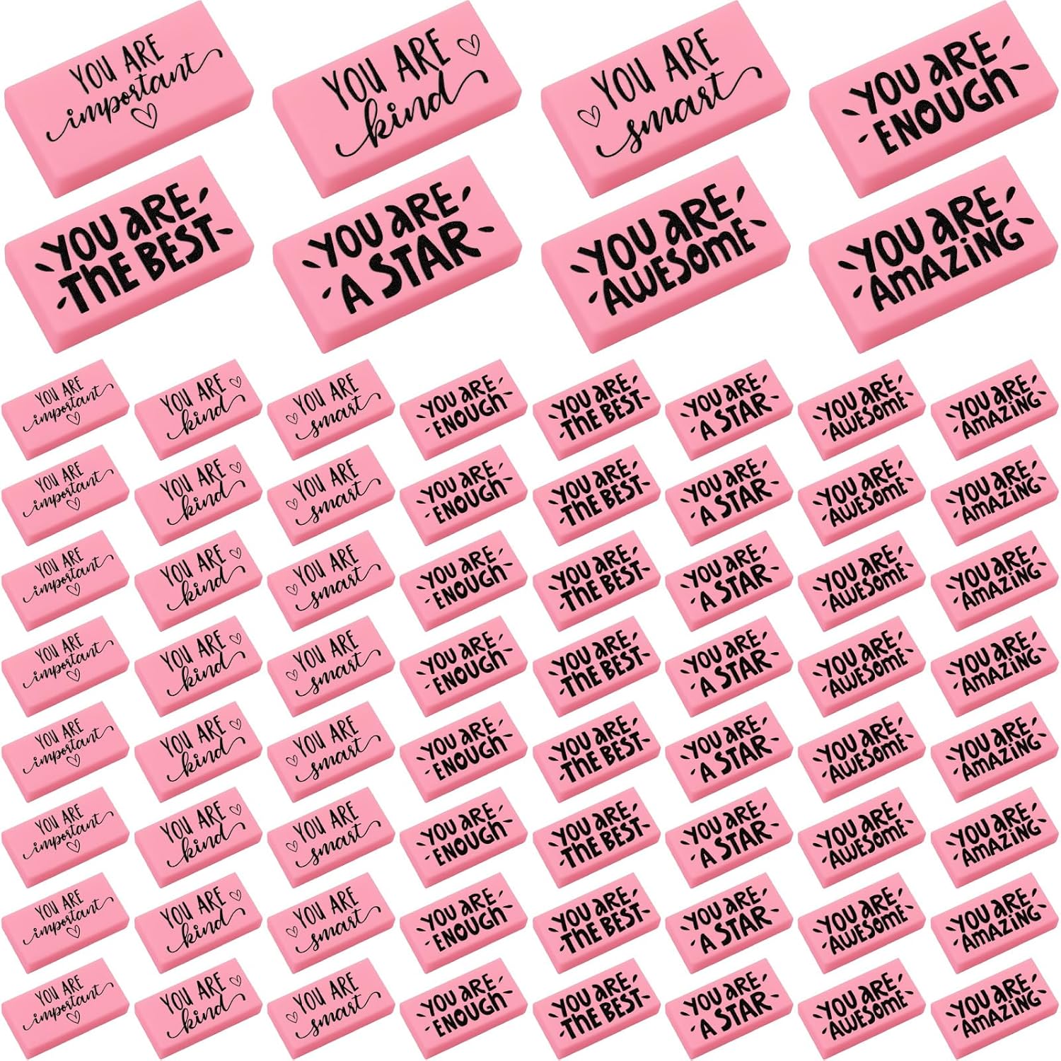 - Aesthetically Pleasing Design: these motivational pencil erasers come in pink color; Decorated with positive words, our erasers make a striking statement, while inspiring you to be more active in your learning; Showcase your colorful personality and drive every time you eliminate a mistake