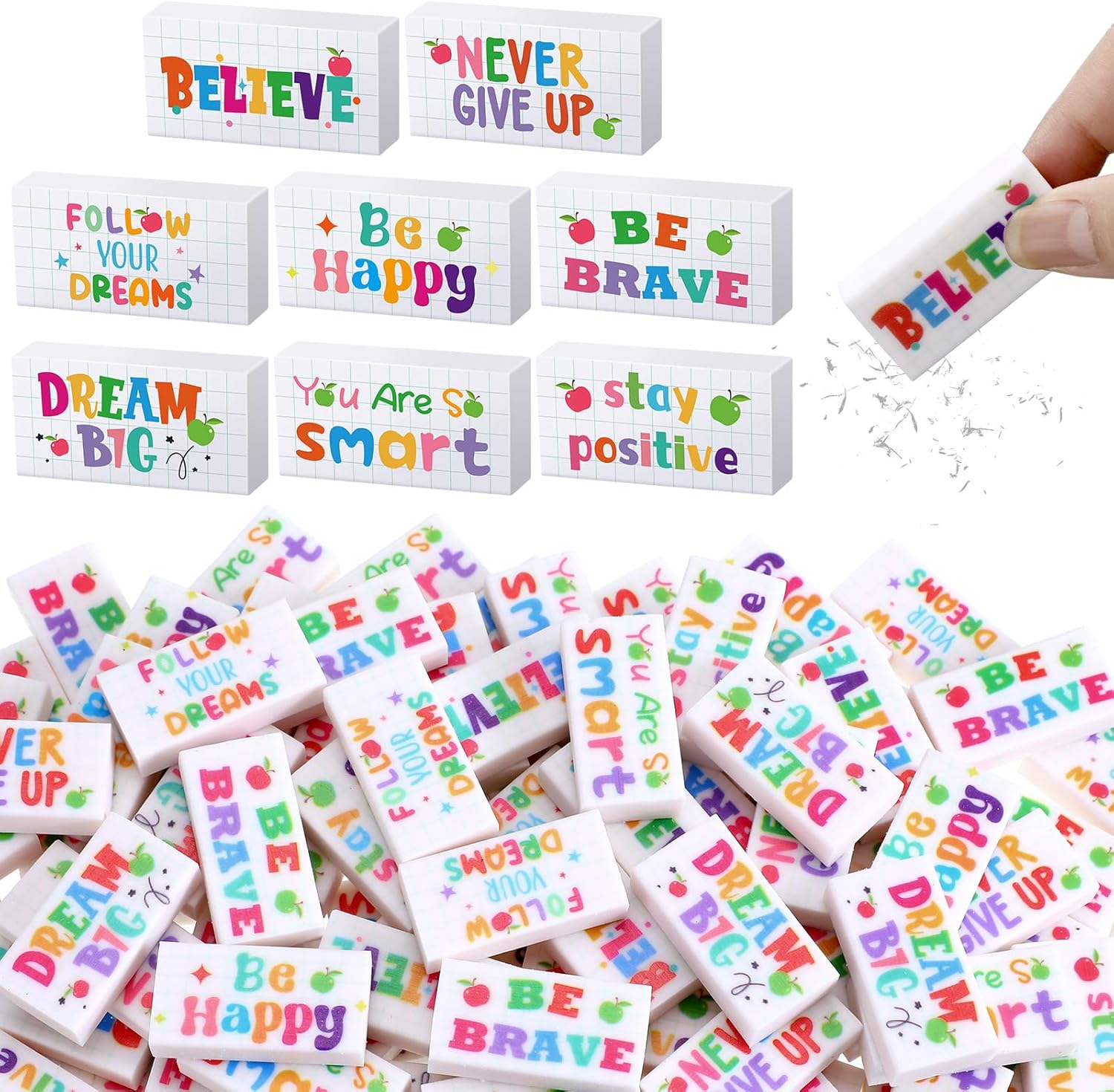 - Inspirational and Fun Design: available in 8 styles and UV printing, these inspirational school erasers sport a variety of cute patterns and powerful words of encouragement such as [you are so smart], [believe], [be happy], [never give up]; These designs are crafted to attract students' attention and provide them with the motivation they need to study more actively and efficiently