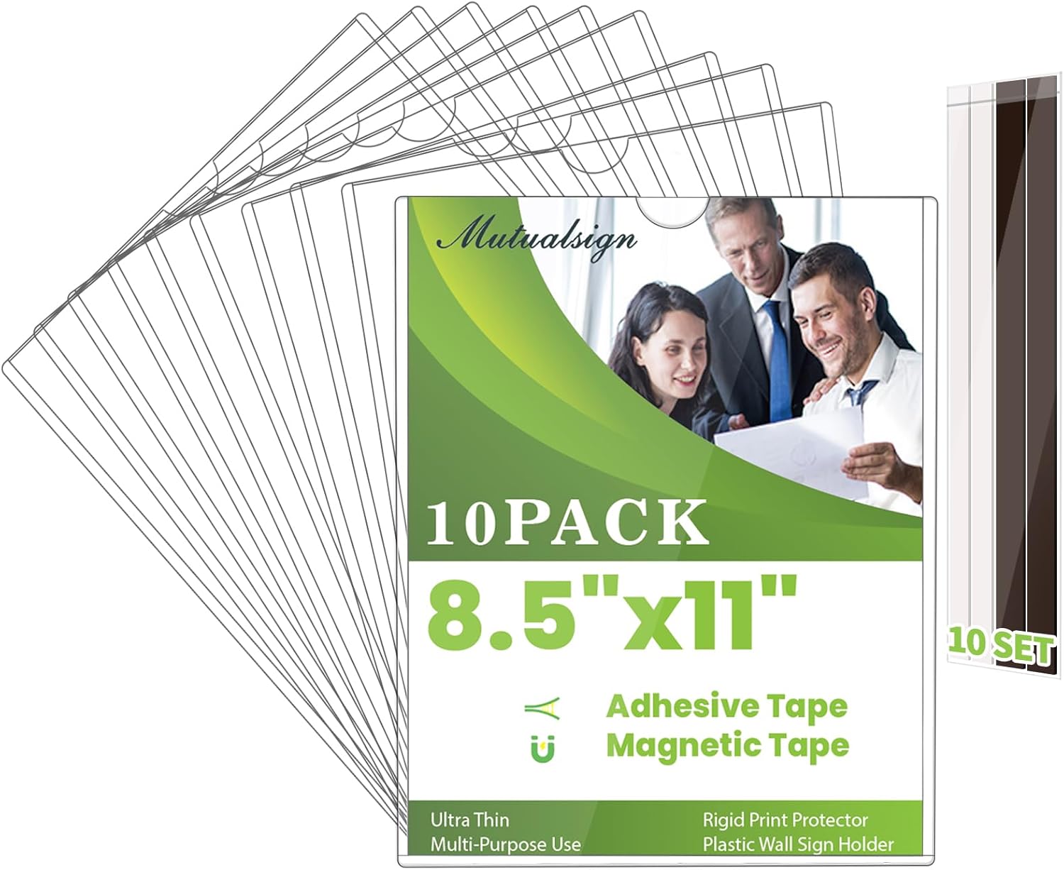 10 Pcs Wall Sign Holder 8.5"x11" Magnetic Sign Holder, Rigid Print Protectors with Adhesive & Magnetic Tapes, Wall Mount Plastic Paper Holder for Office Store Home Window Display (Clear)
