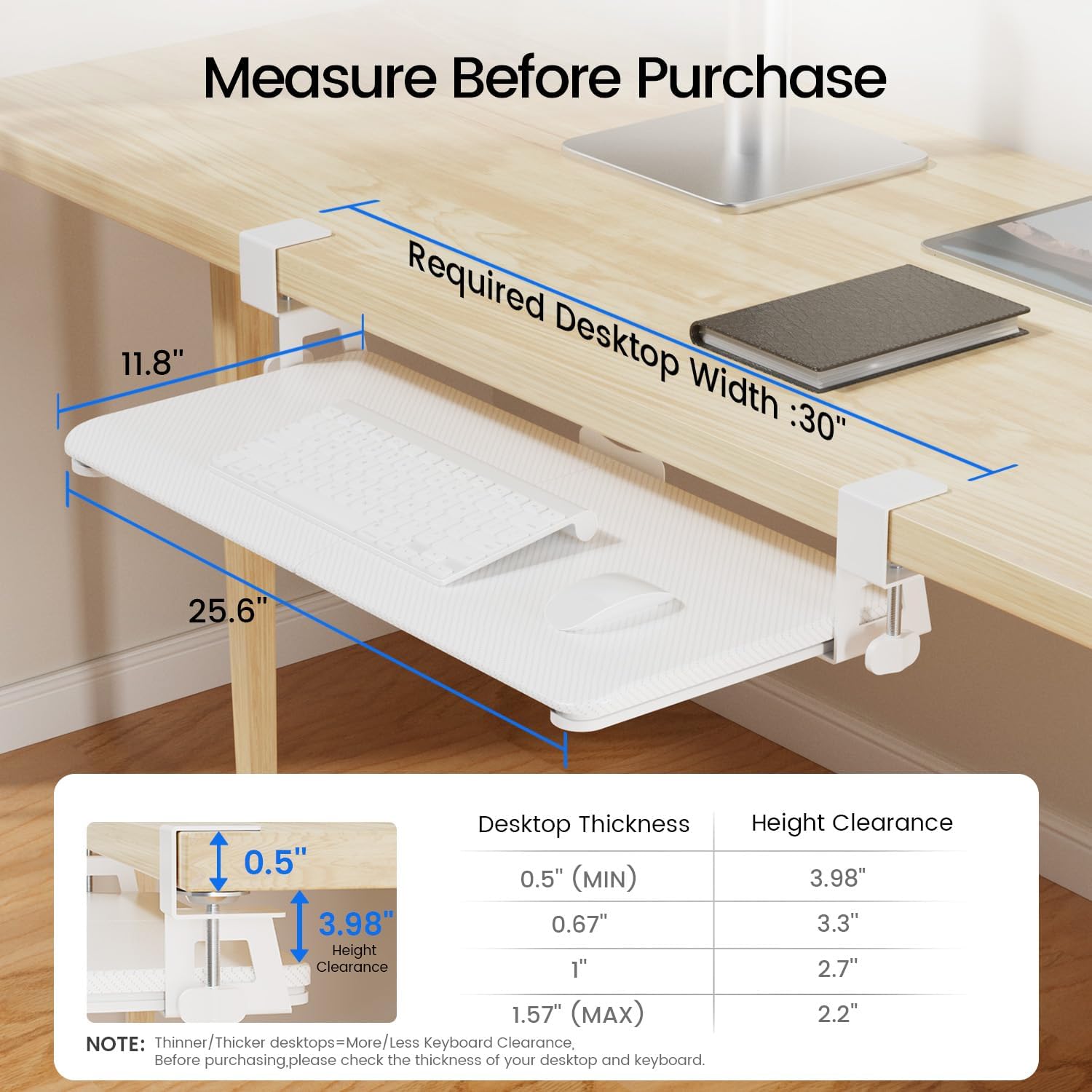 - IMPORTANT – CHECK COMPATIBILITY: This is a LARGE-sized keyboard tray: 26″ x 11.4″.Please measure your desk thickness and available space carefully before ordering,total clamp-to-clamp length is 30″,supports desks 0.5″ to 1.57″ thick.
