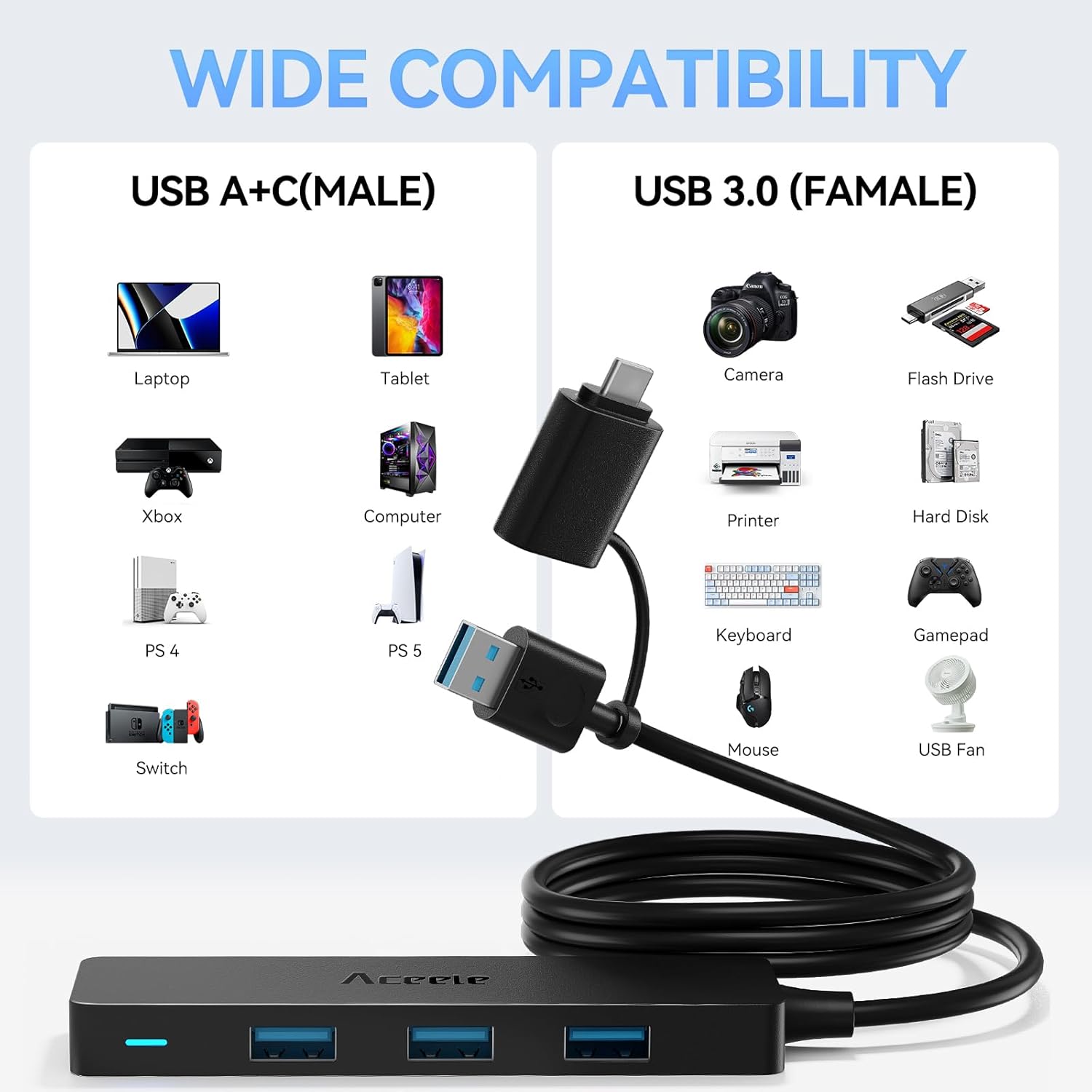 Aceele USB C/A Hub for Laptop, Ultra Slim USB Splitter 4 Port USB 3.0 Data Hub, Multi USB Port Expander with 4Ft Long Extension Cable for Desktop Mini PC,MacBook Air/Pro, iMac, PS5, Flash Drive