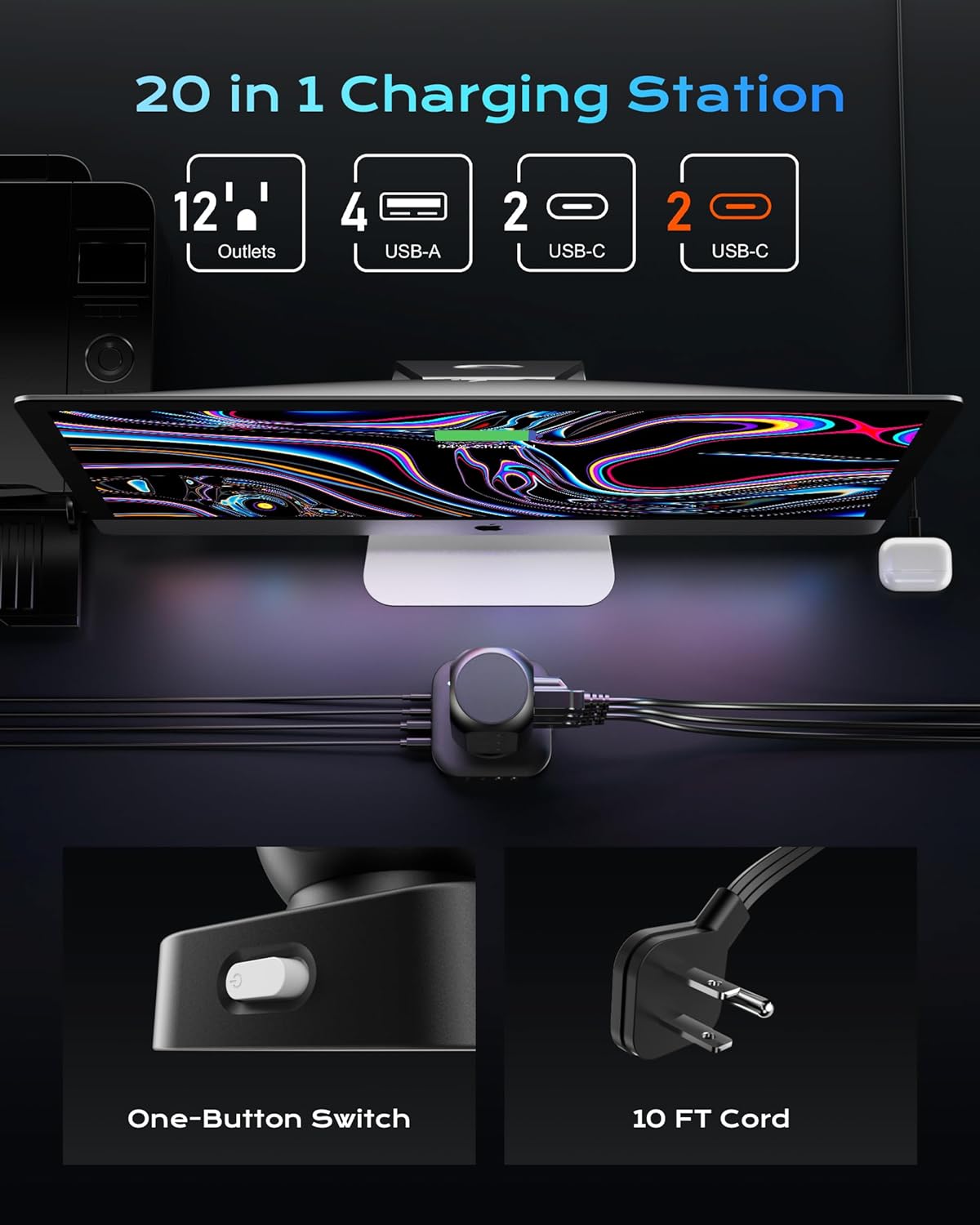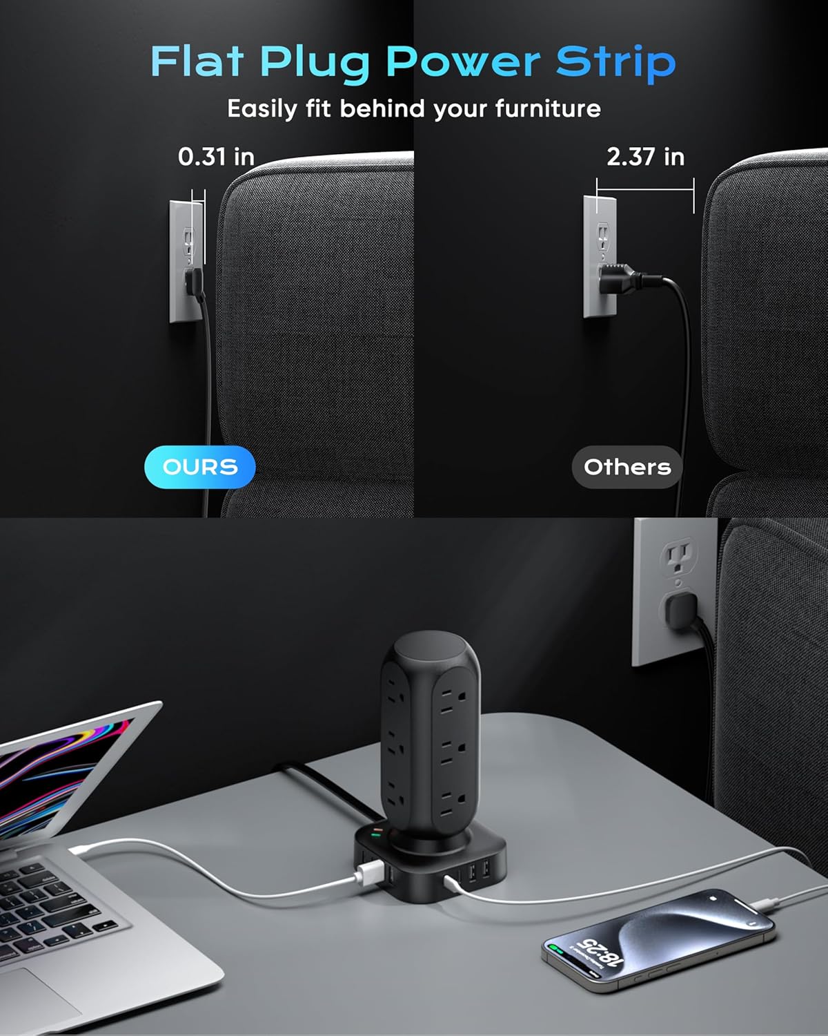 - 【20 IN 1 Power Strip Tower with USB】- This vertical power strip with USB ports features 12 AC outlets and 8 smart-charging USB ports(2 PD 20W USB-C).It can charge 20 devices simultaneously without blocking, keep your desktop organized, widely use in home/office/dorm room. (Note: Please do not exceed the rated power 1875W ).