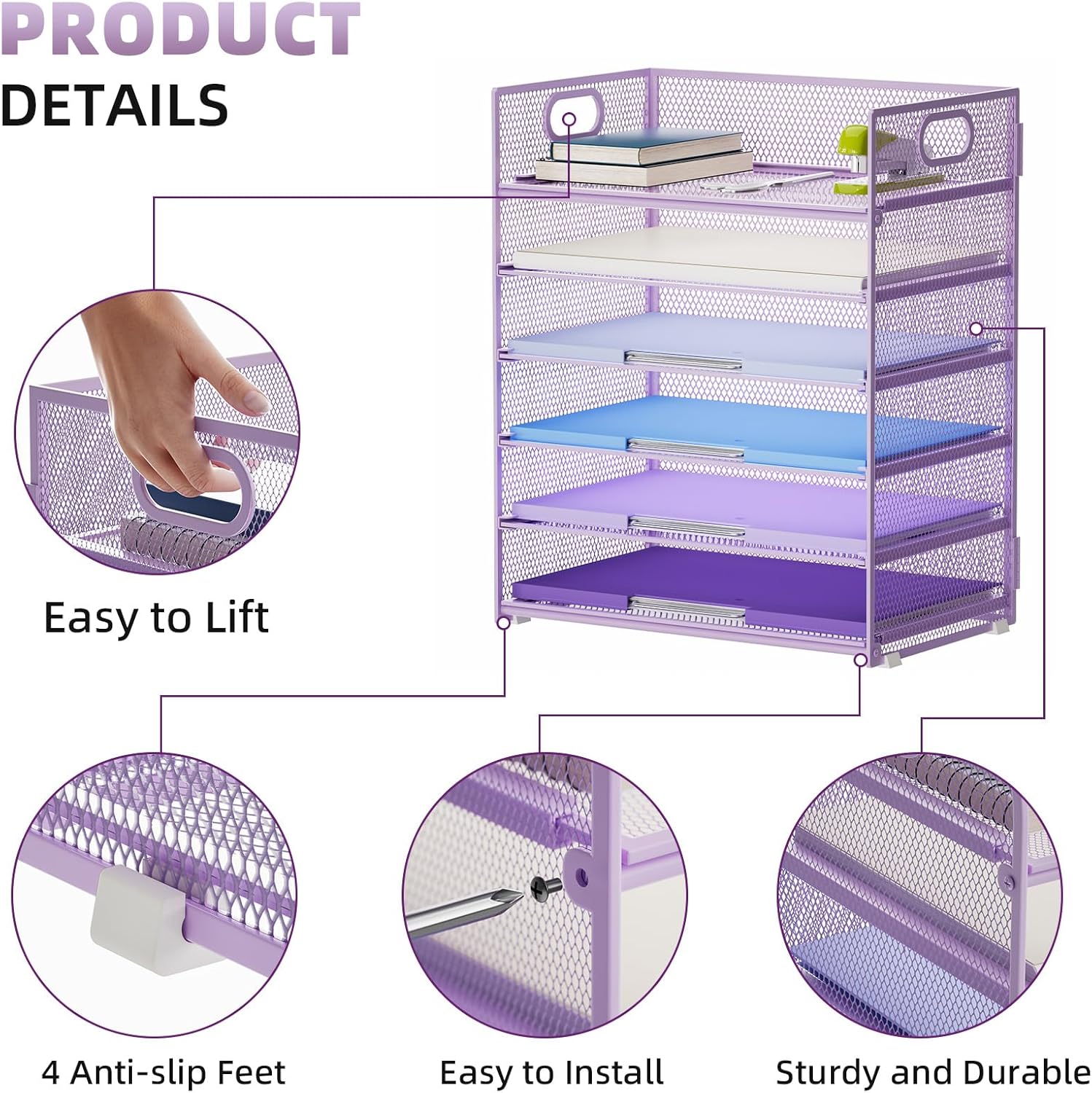 Marbrasse 6 Tier Paper Organizer Letter Tray - Mesh Desk File Organizer with Handle, Paper Sorter for Letter/A4 Office File Folder Holder - Purple