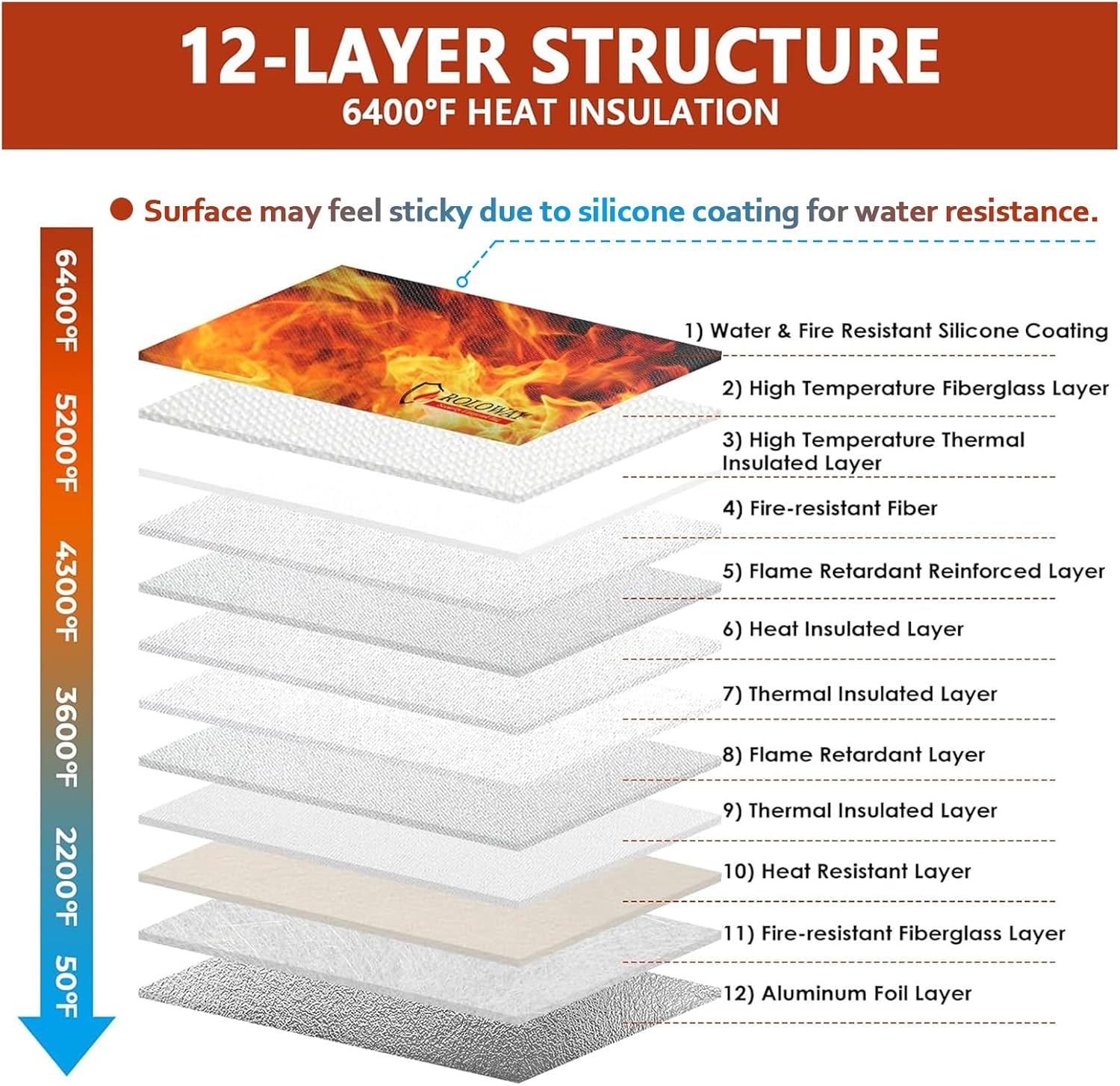 - [ADVANCED 12-LAYER FIRE PROTECTION]: Our fire proof bag for documents features an Enhanced 12-layer Structure, comprising a Silicone Coating Layer, Fireproof Fiberglass (x3), Flame Retardant Layer (x2), Thermal Insulation Layer (x5), and an Aluminum Foil Layer. It provides critical time to retrieve your items in the event of a fire. NOTE: The silicone-coated fiberglass surface may feel STICKY. If you are sensitive to STICKINESS, this product may not be suitable for you.