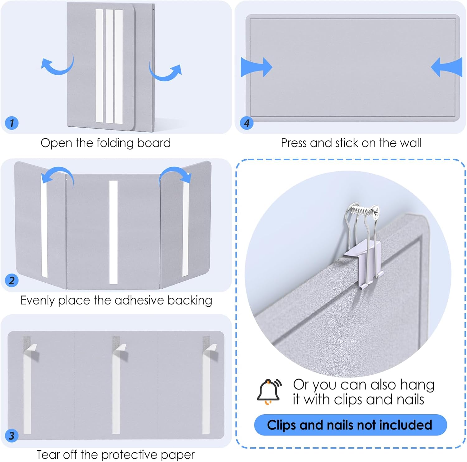 - HOOK and LOOP FASTENER BACKING ADHESIVE - Inserting or removing push pins requires pressing the felt board with your hands to secure it. (Basically no adsorption force in the horizontal direction, super high adsorption force in the vertical direction) You can also change the position of the felt board. You can use a hot hair dryer to remove the adhesive on the wall, and it can be easily removed.