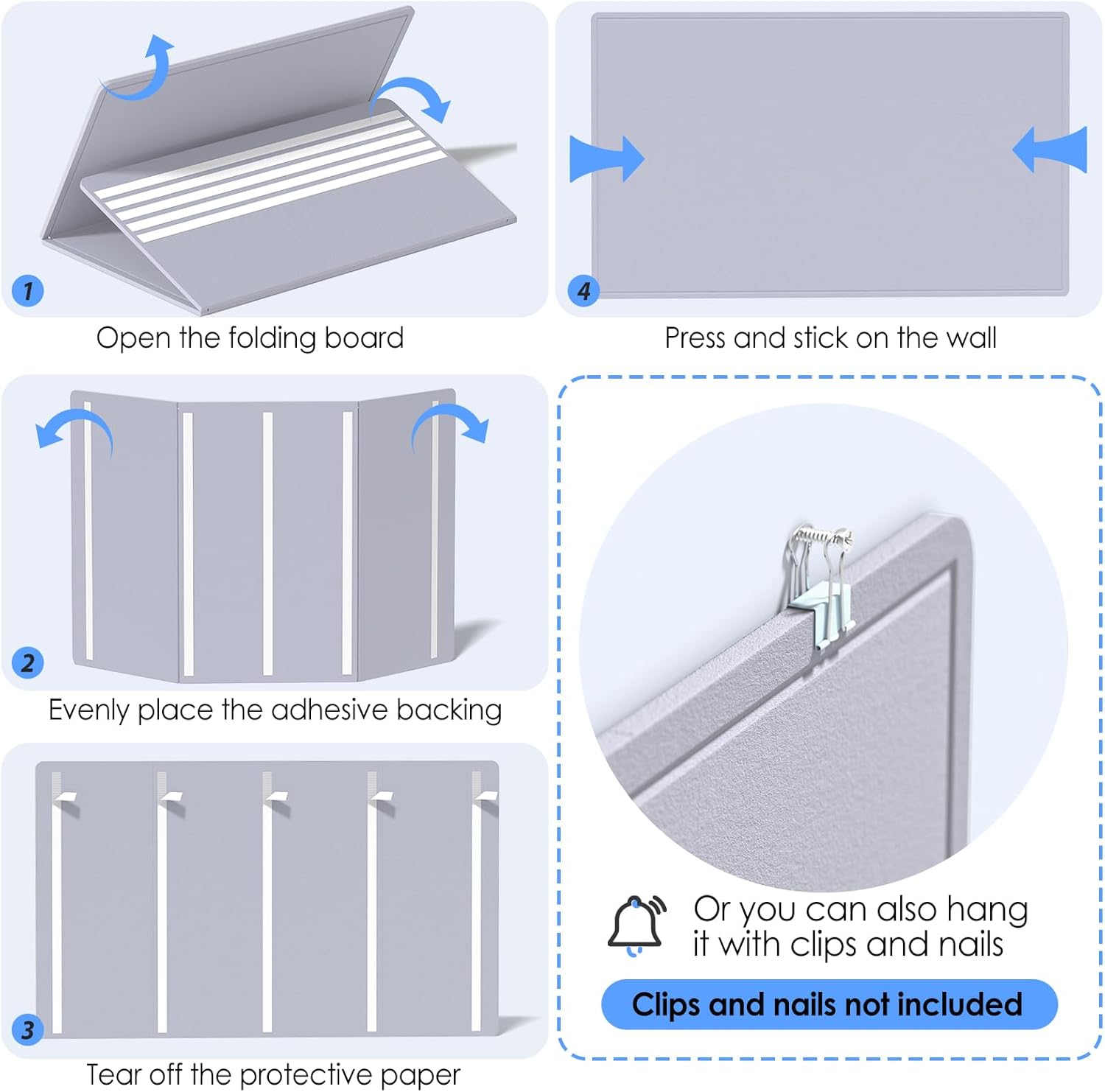 - HOOK and LOOP FASTENER BACKING ADHESIVE - Inserting or removing push pins requires pressing the felt board with your hands to secure it. (Basically no adsorption force in the horizontal direction, super high adsorption force in the vertical direction) You can also change the position of the felt board. You can use a hot hair dryer to remove the adhesive on the wall, and it can be easily removed.