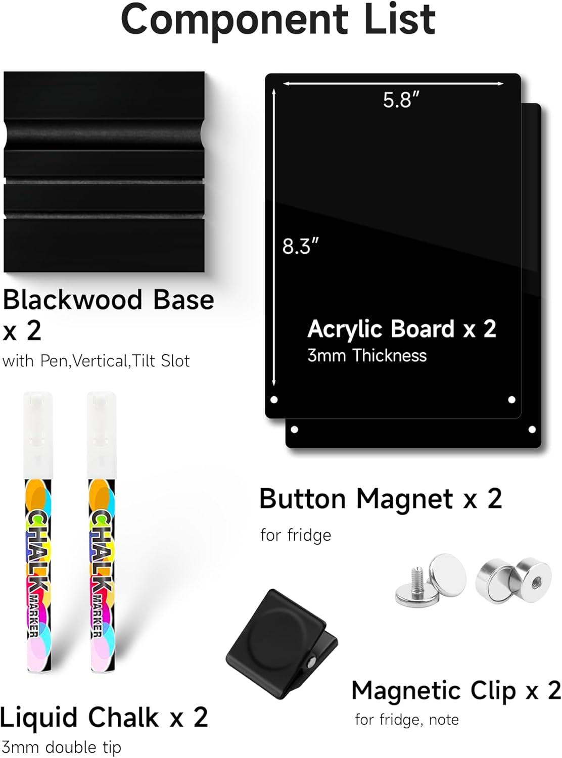 - PACKAGE INCLUDES: Each set of small desktop dry erase boards is supplied with 1 wooden base, 1 liquid chalk marker, 1 magnetic clip and 2 button magnets; Available in 2 sizes to meet different usage requirements: 12 x 8 inches and 8 x 6 inches; If you have any questions or concerns about our products, please contact us and we will be happy to assist you within 24 hours