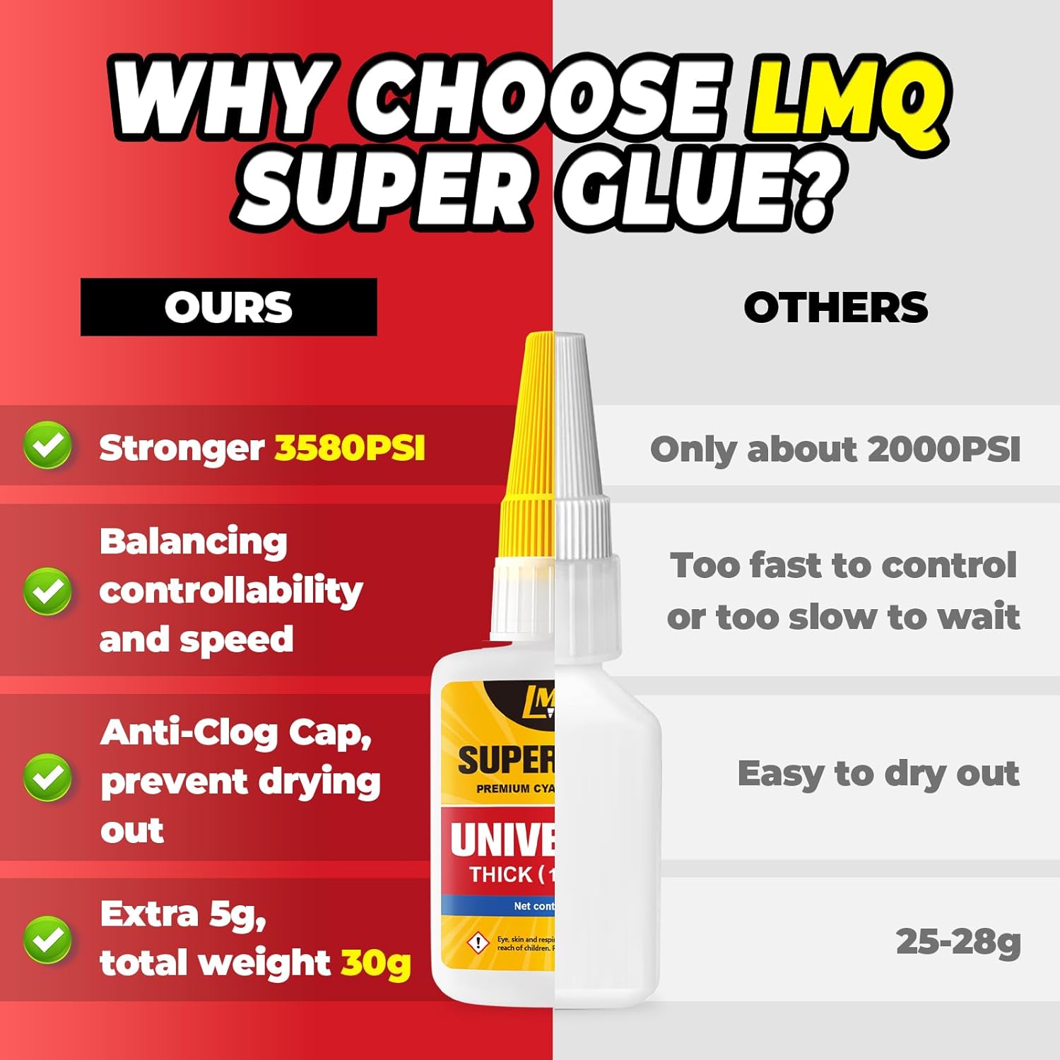 - 💪 Super Strong: Engineered for ultimate durability, this waterproof super glue delivers up to 3580 psi tensile strength on metal, plastic, ceramic, wood for an unbreakable bond, far exceeding the average level of 2000PSI. LMQ super glue is designed for impact resistant and tough that withstand everyday wear and tear.