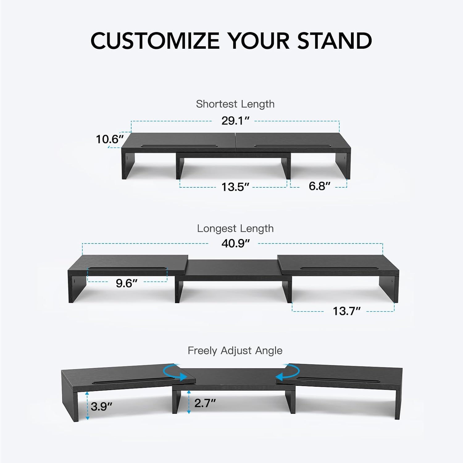 - Adjustable Length & Angle: The monitor stand riser features adjustable length from 29.13″ to 40.9″, allowing you to customize stand size to fit your setup. The adjustable monitor stand also has left and right platforms that can be swiveled inward to fit the right-angle shape of corner desks.