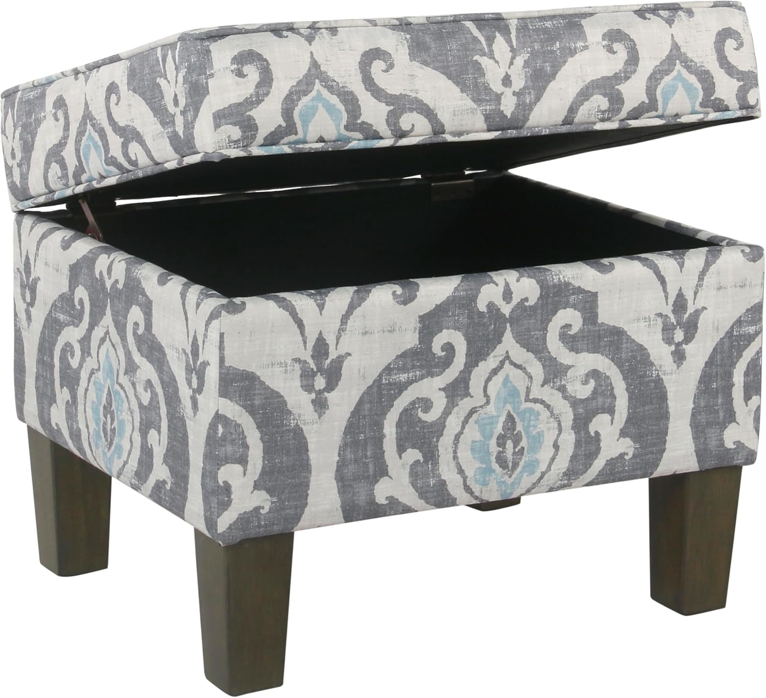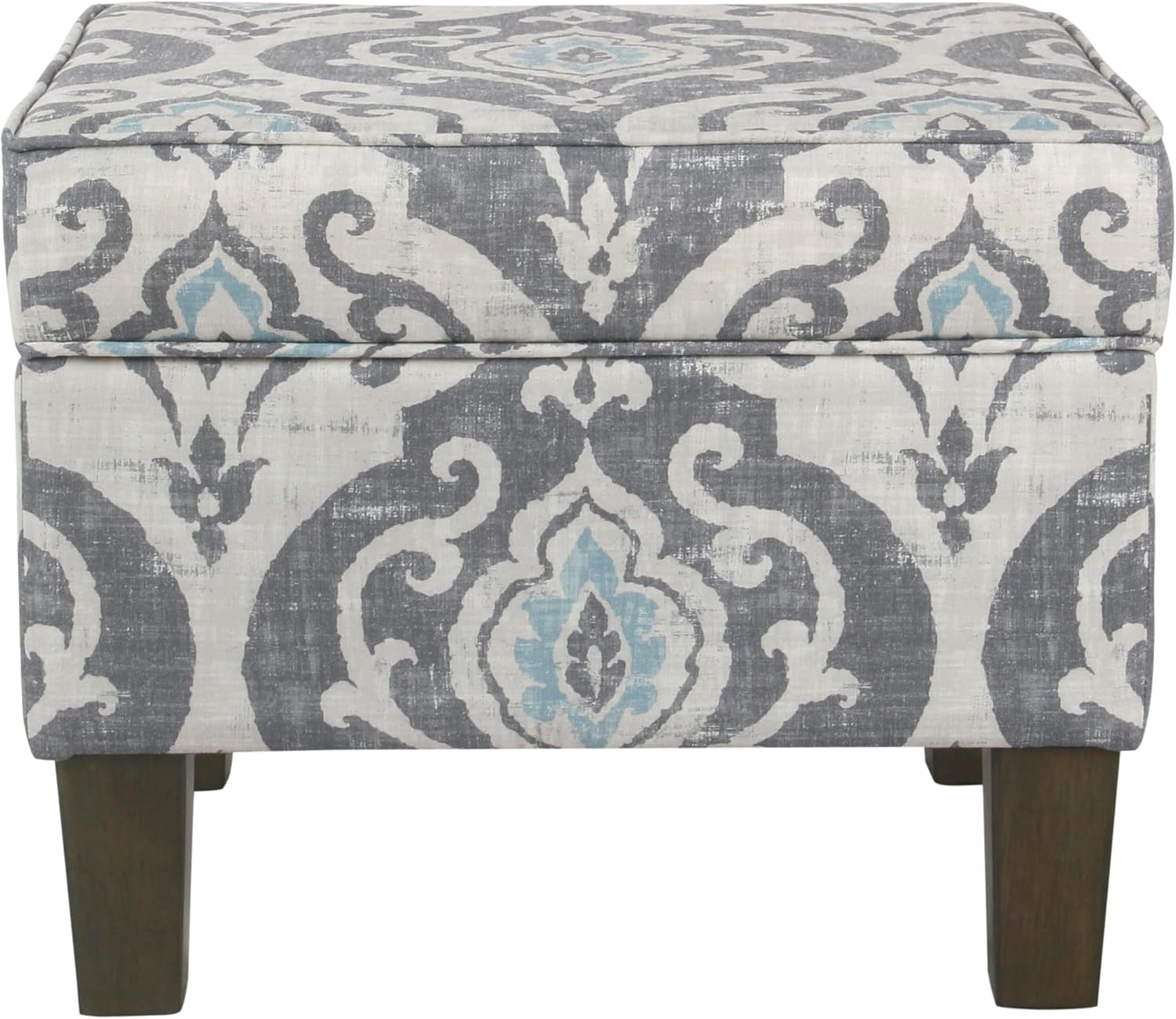 - STORAGE OTTOMAN: Featuring a hinged lid, our Blue and Gray Damask Fabric Storage Ottoman is designed with function and fashion in mind | Perfectly completed with tapered wood legs in a gray wash finish