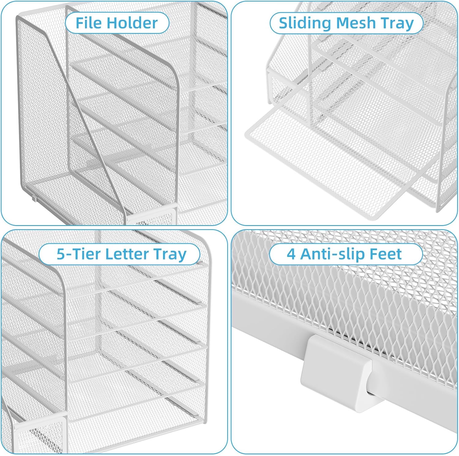 Marbrasse Desk Organizers and Accessories, 5-Tier Paper Letter Tray Organizer with File Holder, Mesh File Organizer, Office Desk Accessories & Organization for Supplies (White)