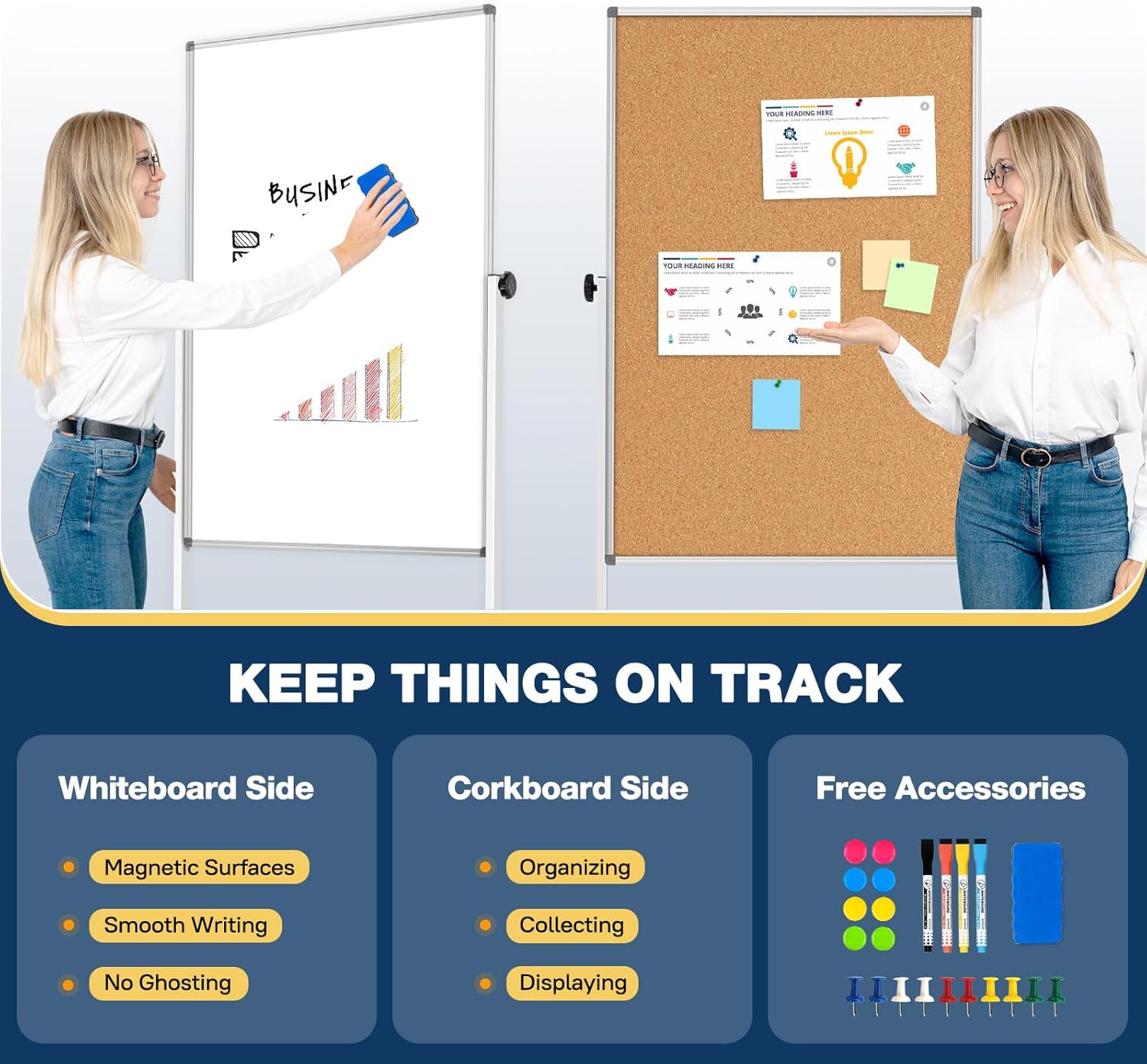 - High-Quality Details - Equipped with a rust-resistant, anti-scratch coating, strong ABS corners, and a sturdy mobile frame, this whiteboard corkboard Combo on wheels is chosen for its mobility, flexibility, and enhanced functionality