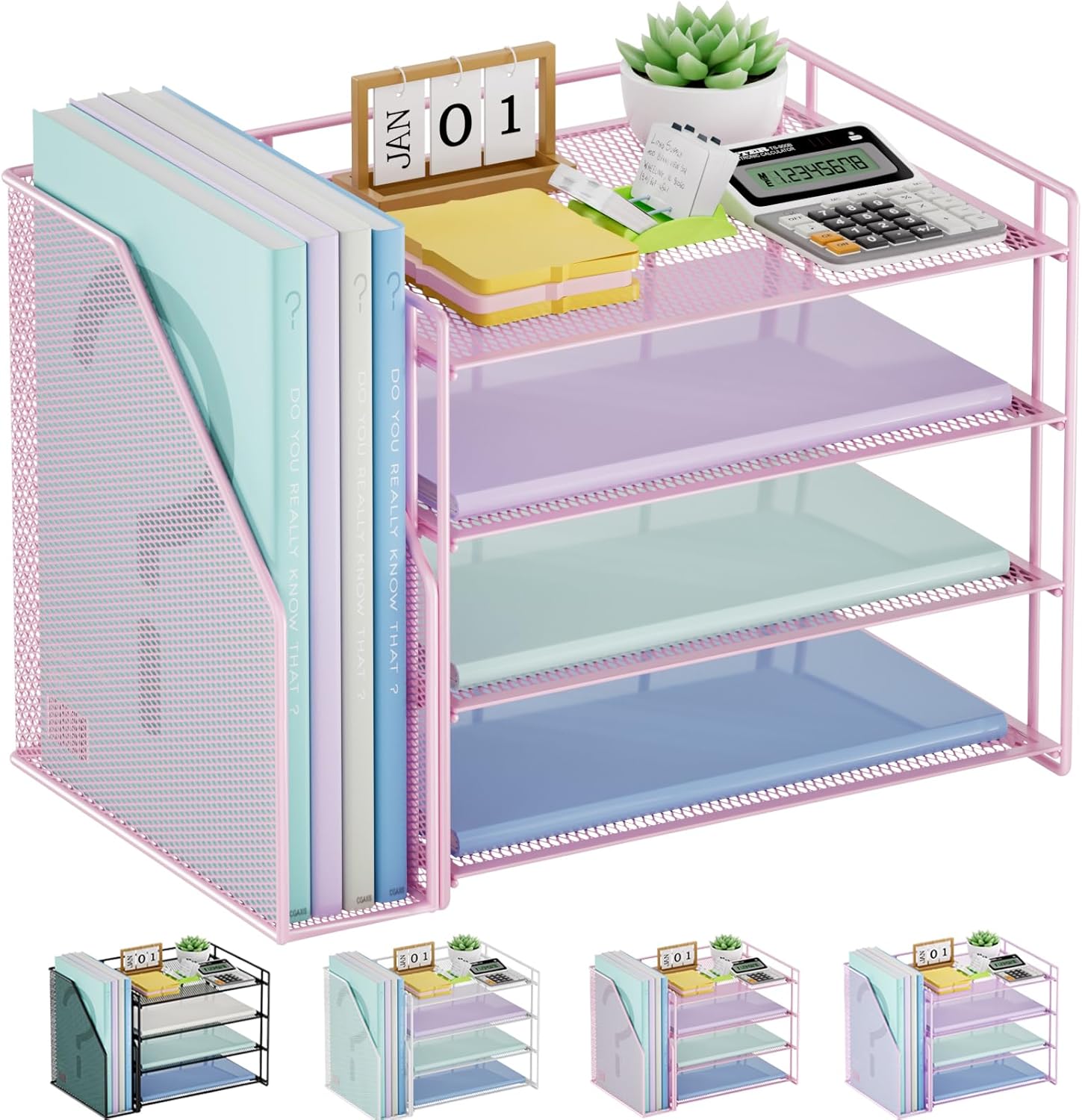 Marbrasse Desk Organizer and Accessories,4-Tier Paper Letter Tray Organizer with File Holder,Desk Accessories & Workspace Desktop Organizers for School Home Office Supplies (Pink)