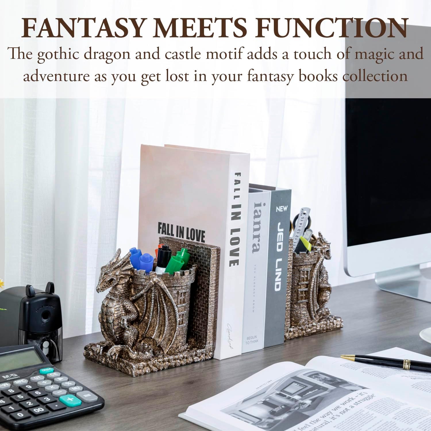 - A Unique Fantasy-Themed Gift: Whether a fan of medieval realms, gothic decor, or an enthusiast of magical and dark, mystical beasts, these book ends with pen holders are the ultimate present for readers of tales from the Middle Ages, safeguarding a collection of fantasy, magic, or adventure literature **Includes full bottom pad**