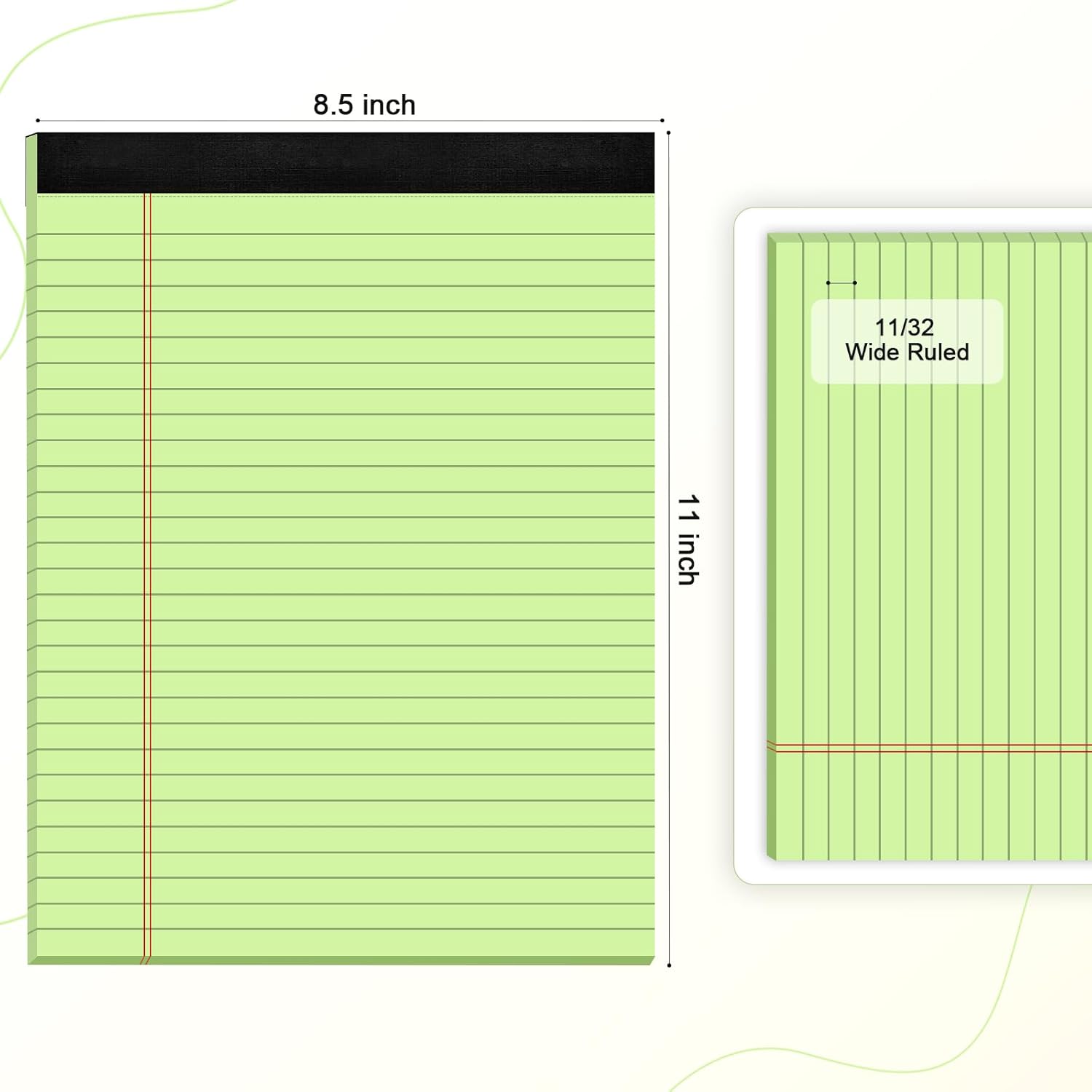 - Green colored Legal Pads 8.5 x 11 Inch are perfect for students, teachers, and professionals. Made with premium 80gsm thick paper, these notepads provide a luxurious writing experience. The colored paper resists ink bleeding, while the black lines and double red margin lines offer ample space for your notes.