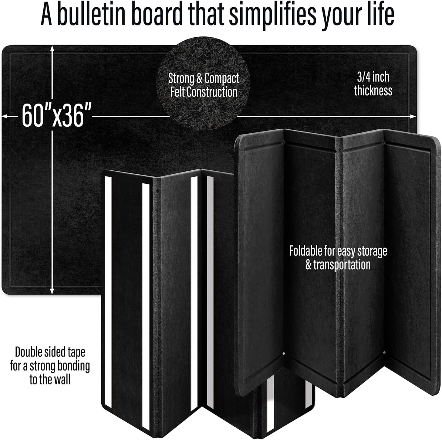 - FOLDABLE, FRAMELESS, AND TRAVEL-READY – Our black felt board measures 60 x 36 inches when in use and folds neatly for compact shipping. Unlike traditional boards, this black bulletin board ships safely with reduced risk of damage and is ready to mount right out of the box.