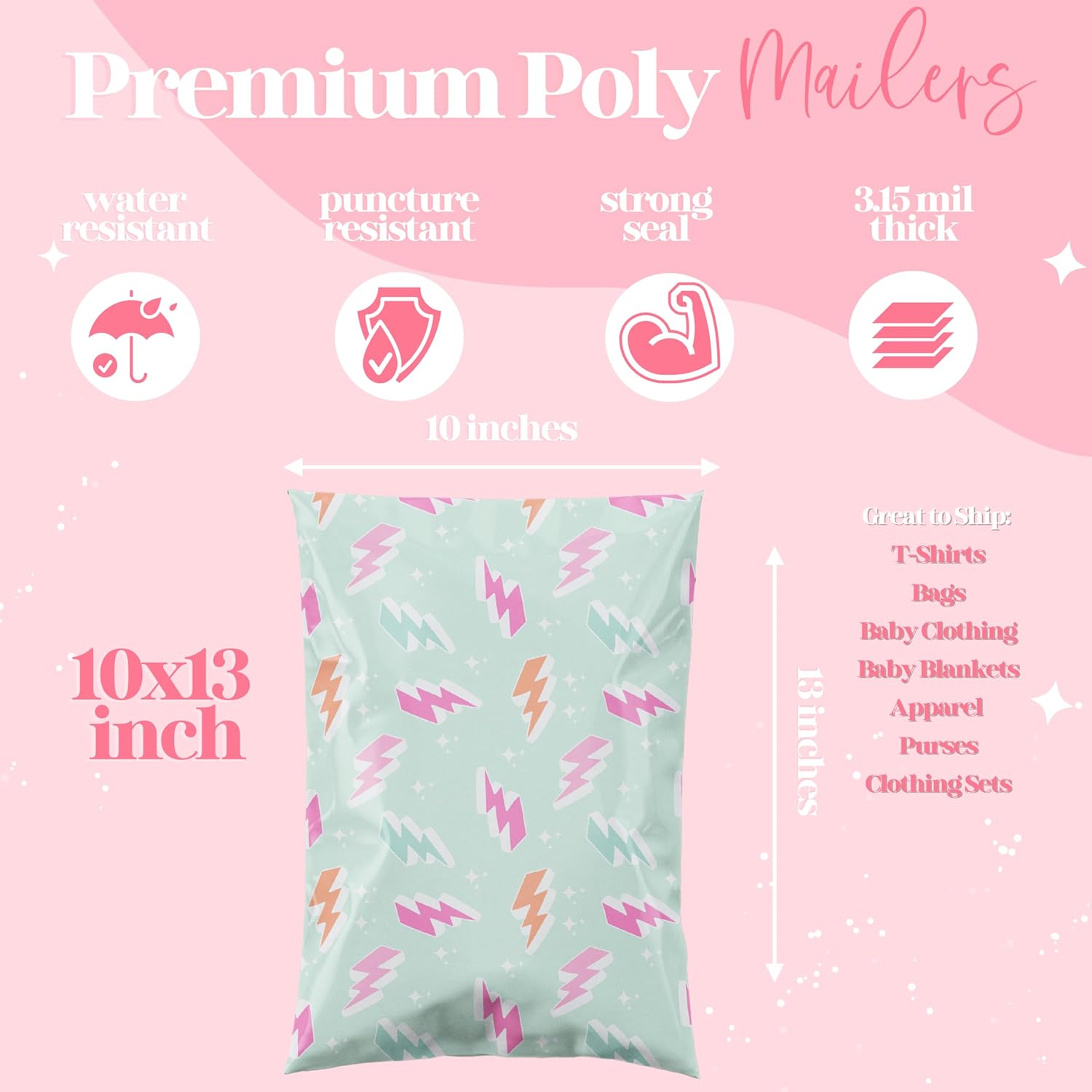 10x13 Designer Poly Mailer 100 Pack Heavy Duty Waterproof Self Seal Shipping Bags for Small Business Large Mailing Envelopes Bulk Tear Resistant Cute Packaging Lightning Bolt