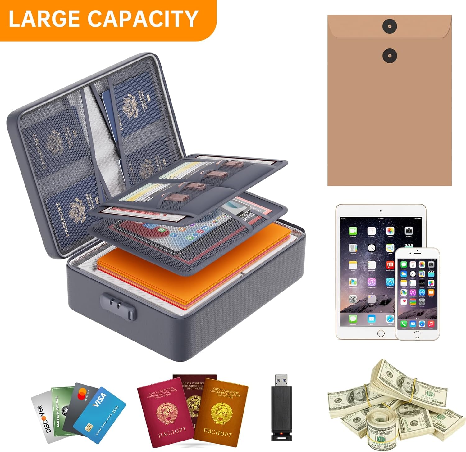 - Soft Box: Large-capacity(15"x11"x4.1"),Compared with other bags,our fireproof file organizer adopts a multi-layer design that can meet all your storage needs. These include 8 passport mesh bags,16 card slots, 4 U Disk pockets, 7 folder layers and one main pocket with a large space. It can store your important documents,files,money,passport,U Disk,cards,laptop,certificates in a safe and orderly way.Great way to organize your files easy for you to find whatever files you looking for quickly
