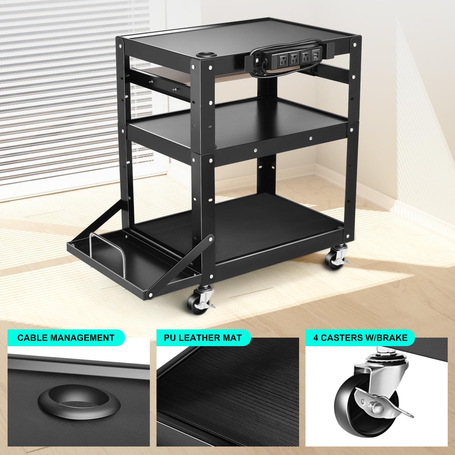 DNA MOTORING Steel AV Cart 3-Layer Rolling Projector Utility Cart, 24" X 18" X 20" - 30.5" Height Adjustable, with Wheels, Pullout Keyboard Tray, Power Strip, Cord Management, TOOLS-00495