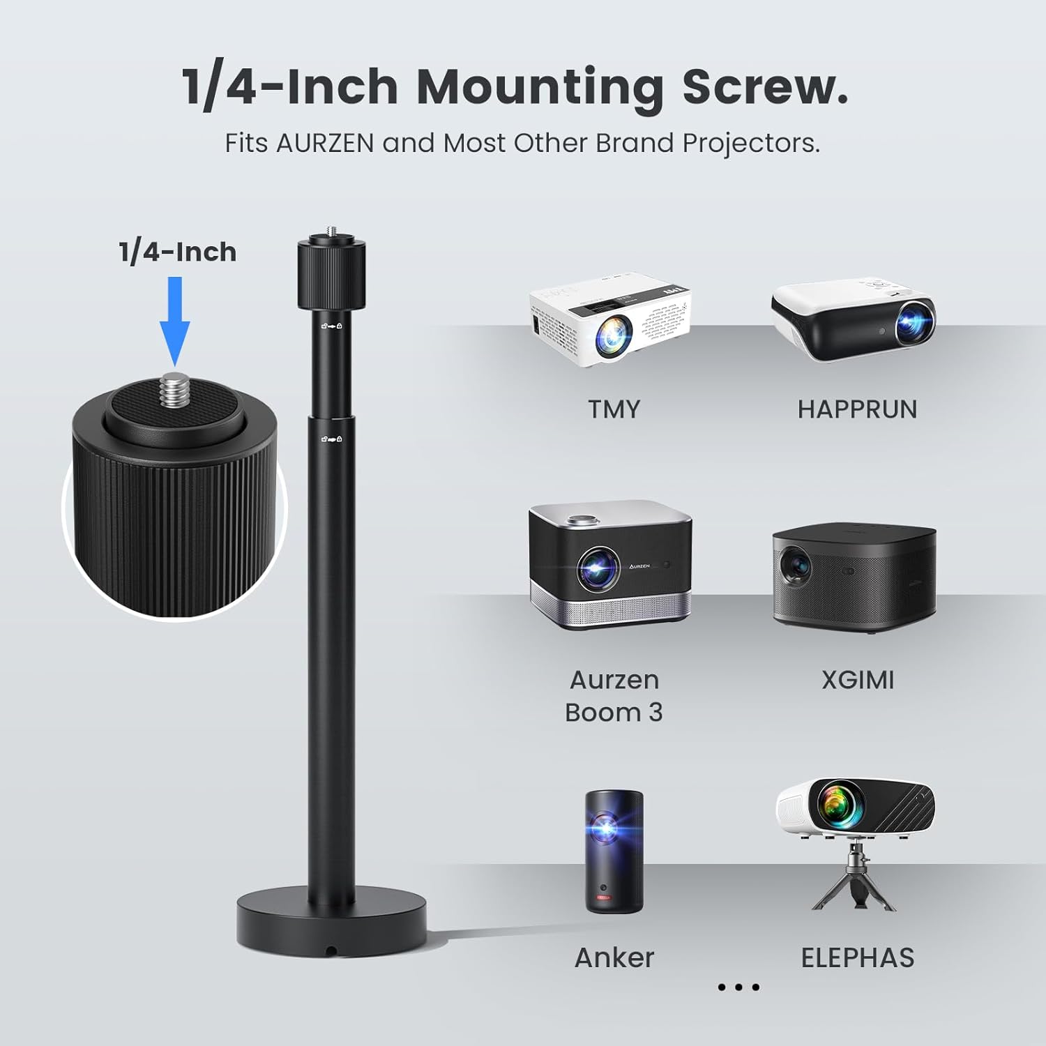 - Universal Ceiling Mount: Compatible with Aurzen, TMY, HAPPRUN, Yaber, Epson, and other projectors that have a centered 1/4-inch (6.35 mm) screw thread only. Off-center, M6/M8, or any non-¼″ threads are not supported. Designed exclusively for secure ceiling installation