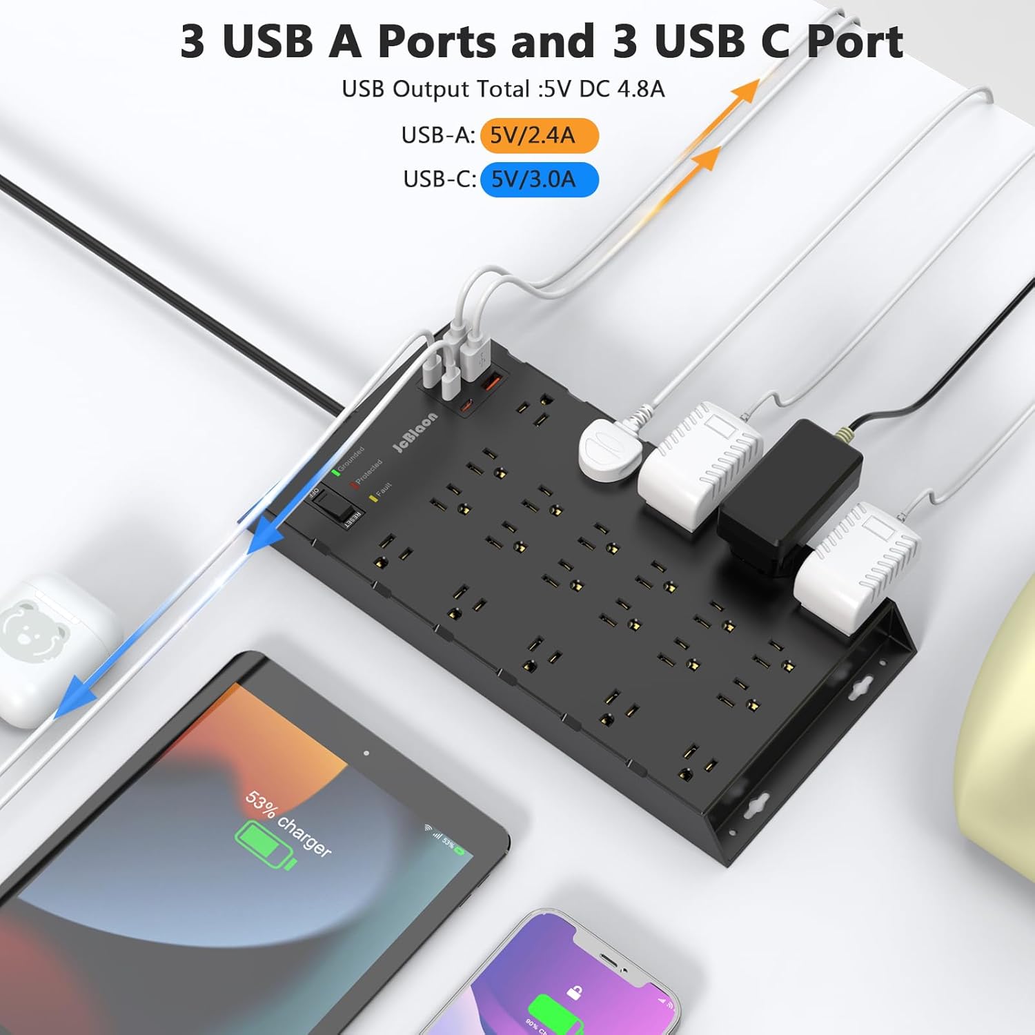 - 【28-in-1 Multi Plug Power Strip】With multiple safety-certified , the extension cord and flat plug certified by UL.Jcblaon Power Strip Surger Protector features 22 grounded 3 sockets and 6 USB ports (3 USB-C & 3 USB-A), providing power for all devices that you need to plug in at one location. Perfect for phone,gaming,camera,TV,iphone, PC, laptop,fan, gaming computers, lamps, and other devices simultaneously.