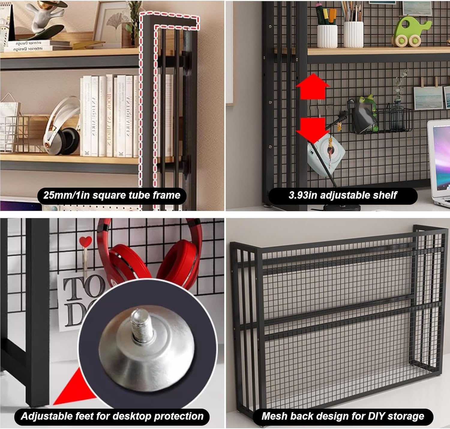 - 【Flexible Design】: The height of the desktop bookshelf shelf can be adjusted by 10cm/3.93inch to adapt to different monitor heights. Equipped with adjustable foot pads, whether it is on the ground or on the desktop, it is always stable and balanced to avoid scratches on the desktop.