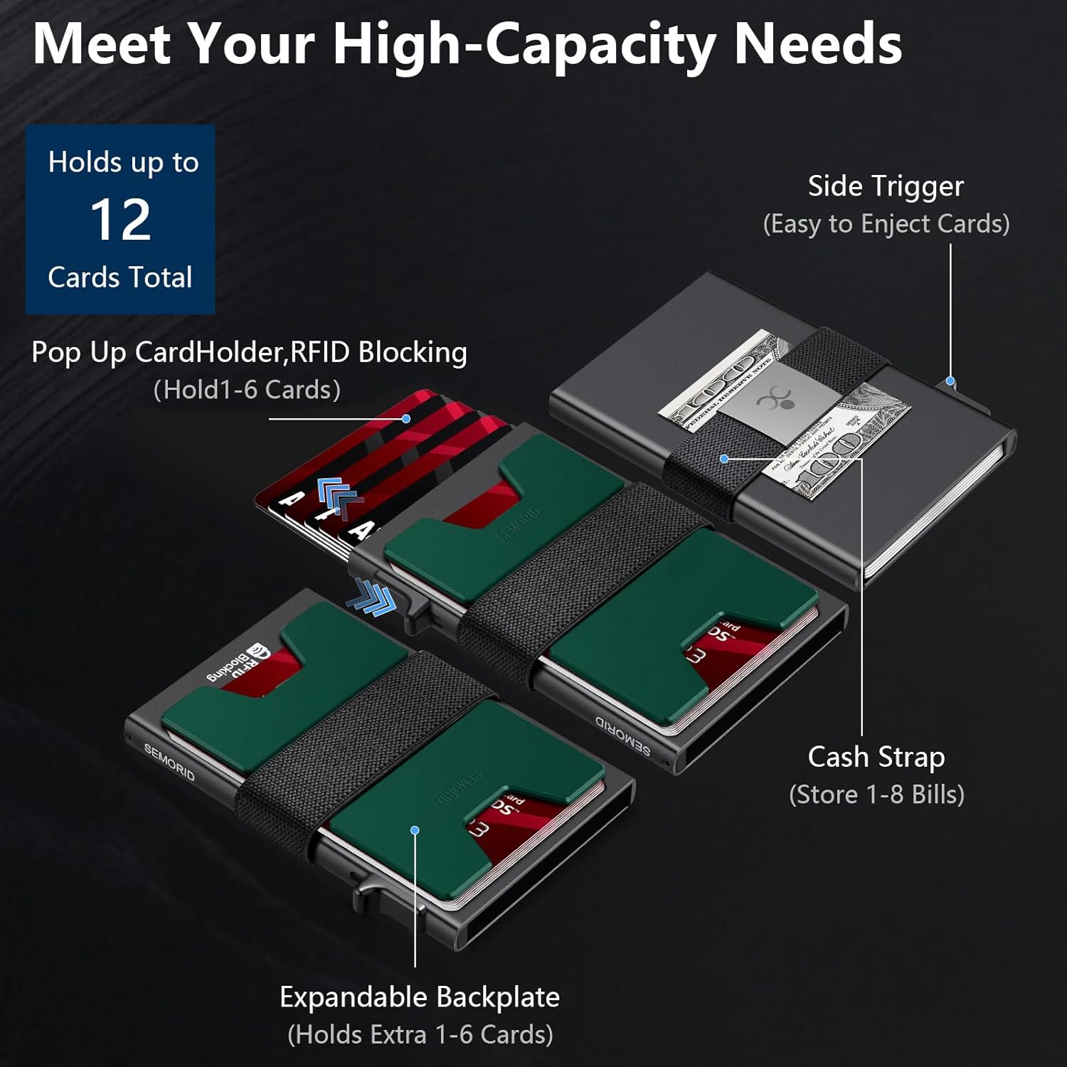 Slim Aluminum Card Holder Wallet for Men, Durable Expandable Backplate, RFID Blocking Minimalist Metal Pop Up Wallet, Holds 12+ Cards Plus Cash